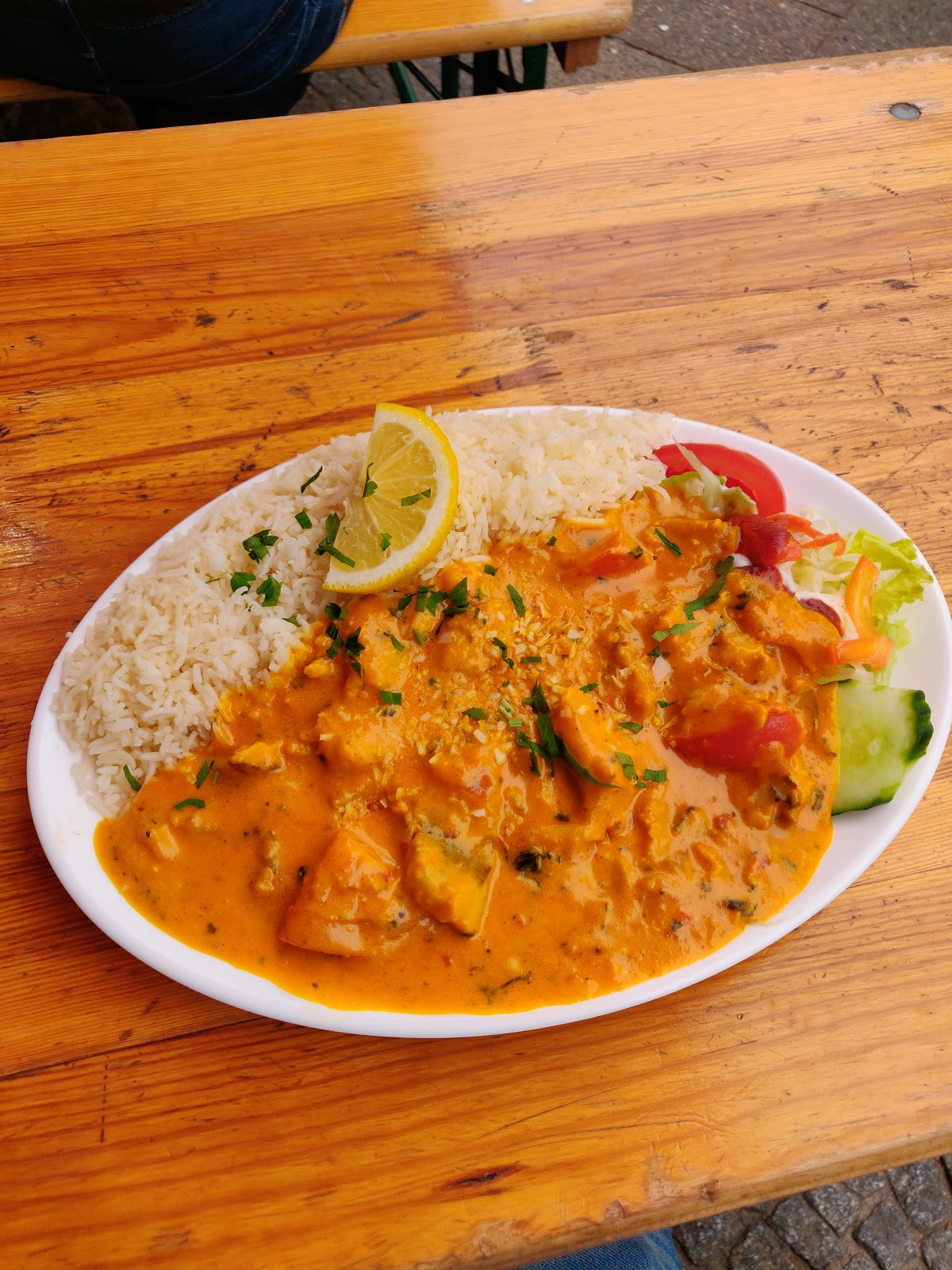 A nice and cozy place for Indian meals. The ordered dishes (Chicken Khumbi i.e. Chicken with mushrooms, and Chicken Jalfrezi) were served with a portion of rice and salad. One platter can serve as a complete meal for a single person, depending on your appetite. Flavourful food, customization (scharf) was possible. People (Germans u0026 Turkish) were also enjoying chickpea curry, samosas, and pakoras here ????.