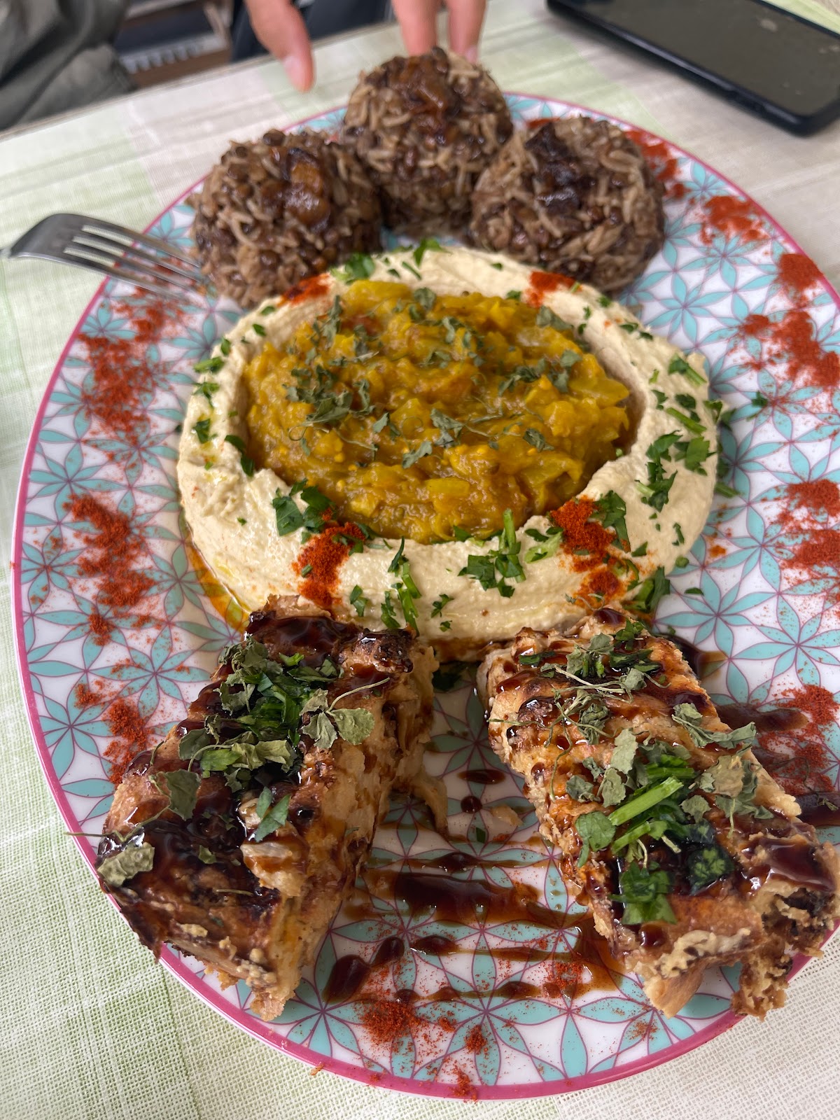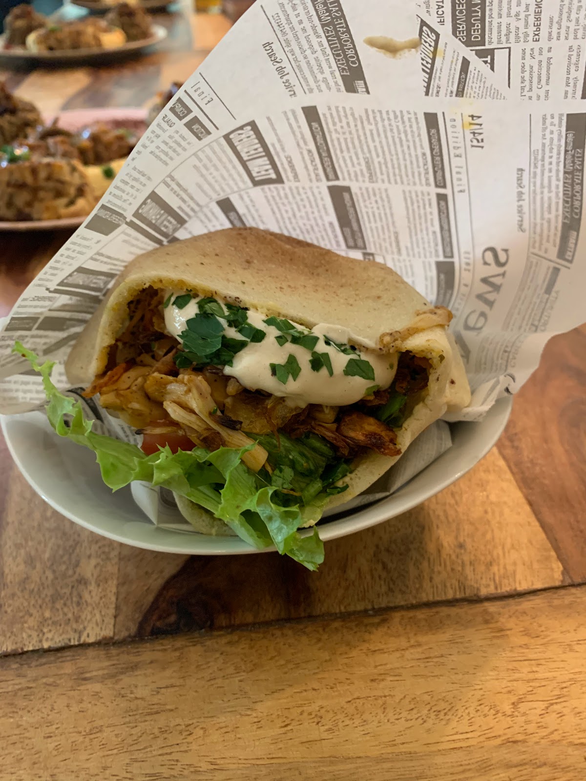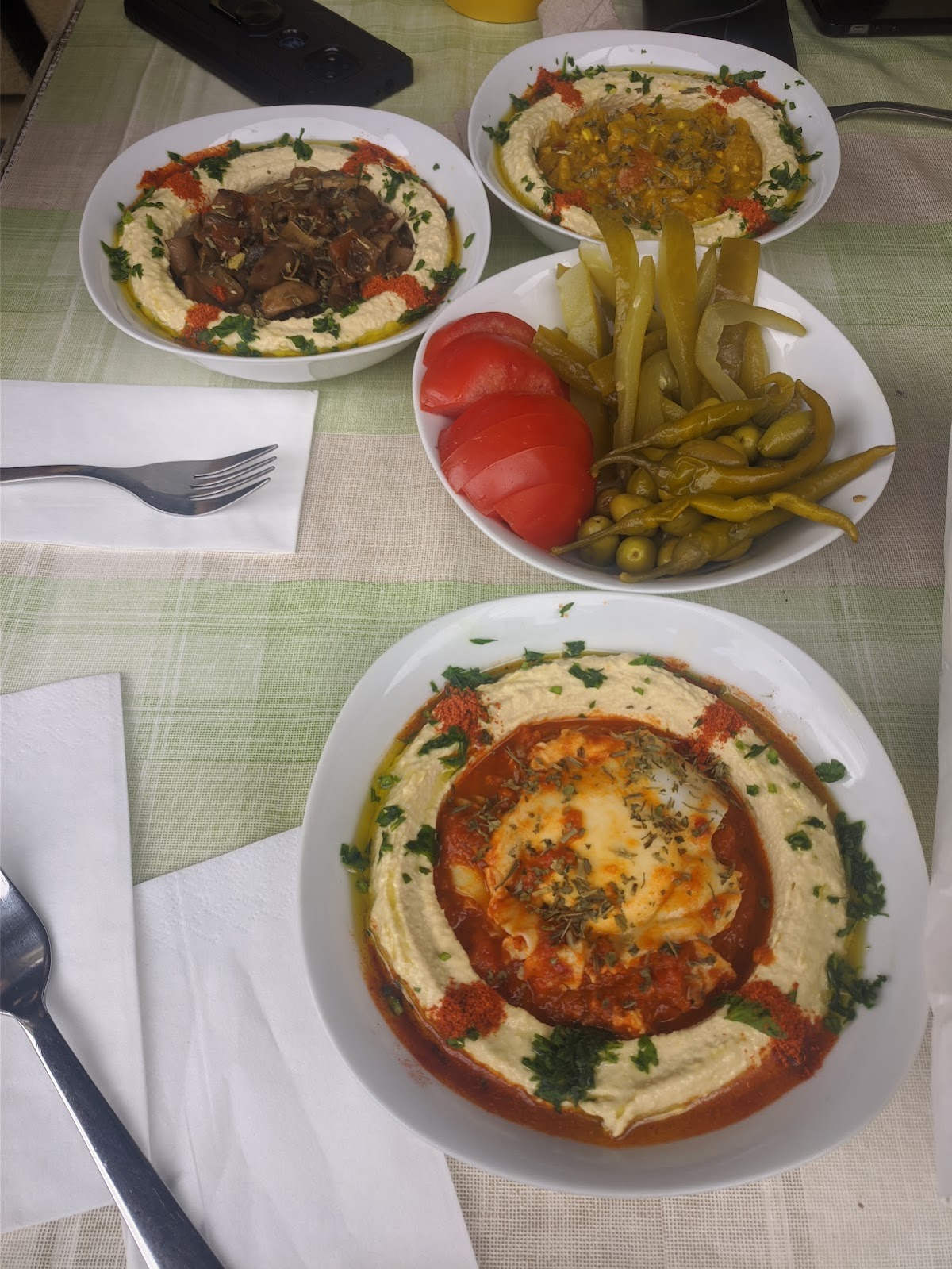 We ordered the shared platter with mushroom hummus and it's one of the most amazing things we have ever eaten. The platter is gigantic and comes with two cauliflower quiches, three little rice and lentils towers, a side of normal hummus, spice, a small salad, two pocket breads and the main hummus flavor you've chosen. The spices and flavour overall are amazing and work wonderfully together and it definitely fills two or more people up. The staff was super nice and even though the coffee machine was broken the waiter offered us a coffee made with his own coffee brewer. It's a super cheap and a quick place. i would definitely go again - can only recommend!