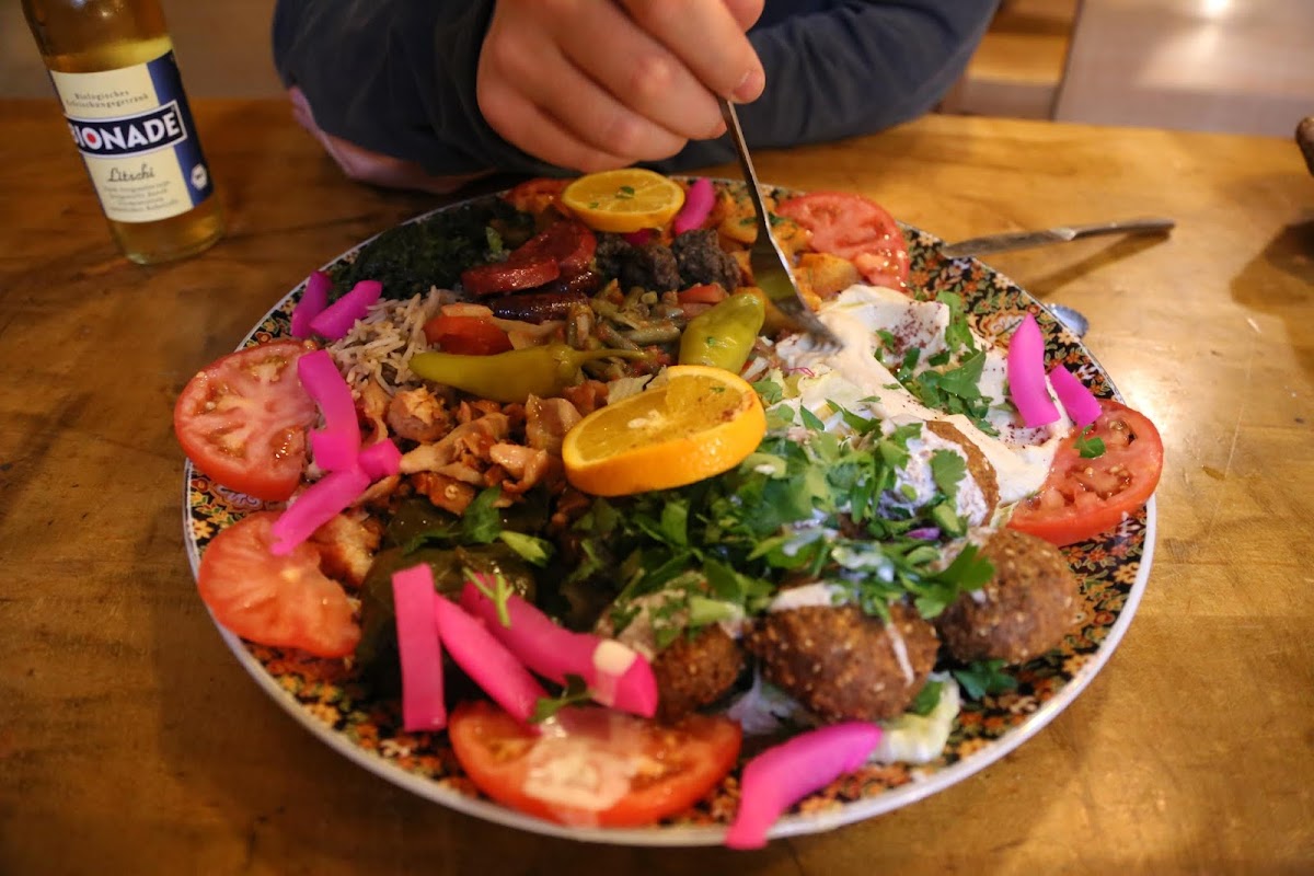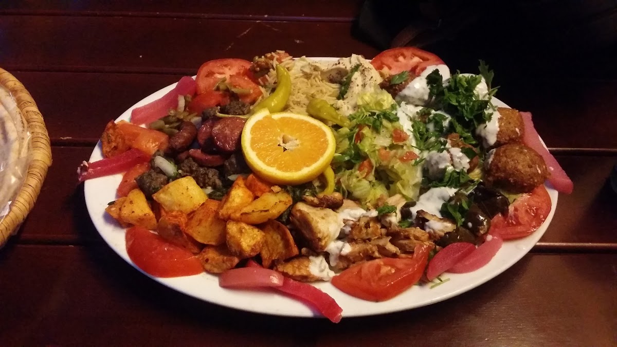 We ordered a huge vegetarian plate to share. (Looks smaller on the picture). It was amazing. I've never had such good falafel in my life!