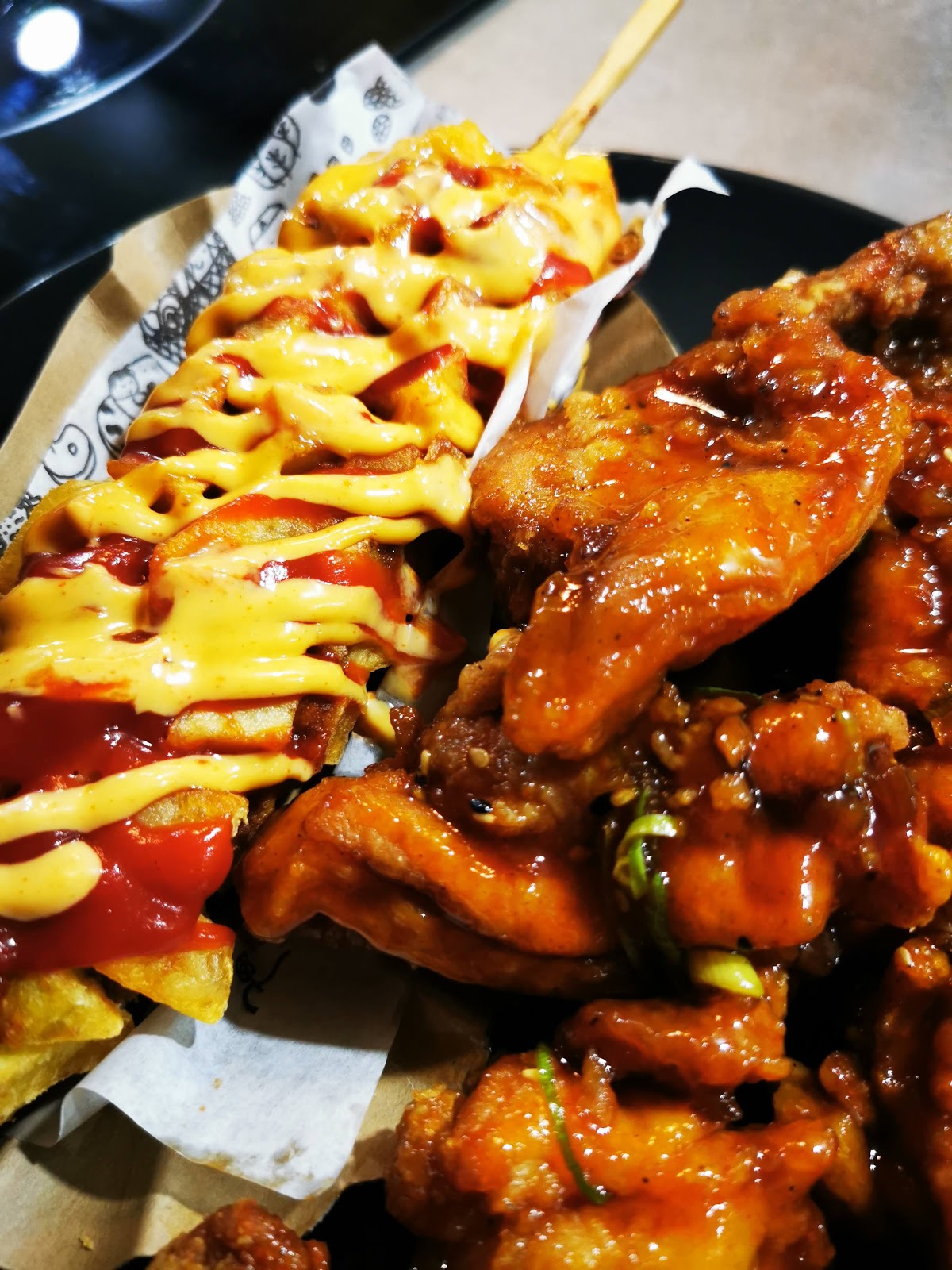 I was extremely happy with this food. From a very long time I wanted to eat proper Korean chicken and finally I found it. You can choose chickens in different tastes and they all taste cool. Hotdog was top of the top for me! It really was my taste. Everything also looked nice. The only thing which I would change is the quality of a chicken, I had a feeling that it's a cheap sort of chicken and it would be 10 times nicer if it would be a better one.