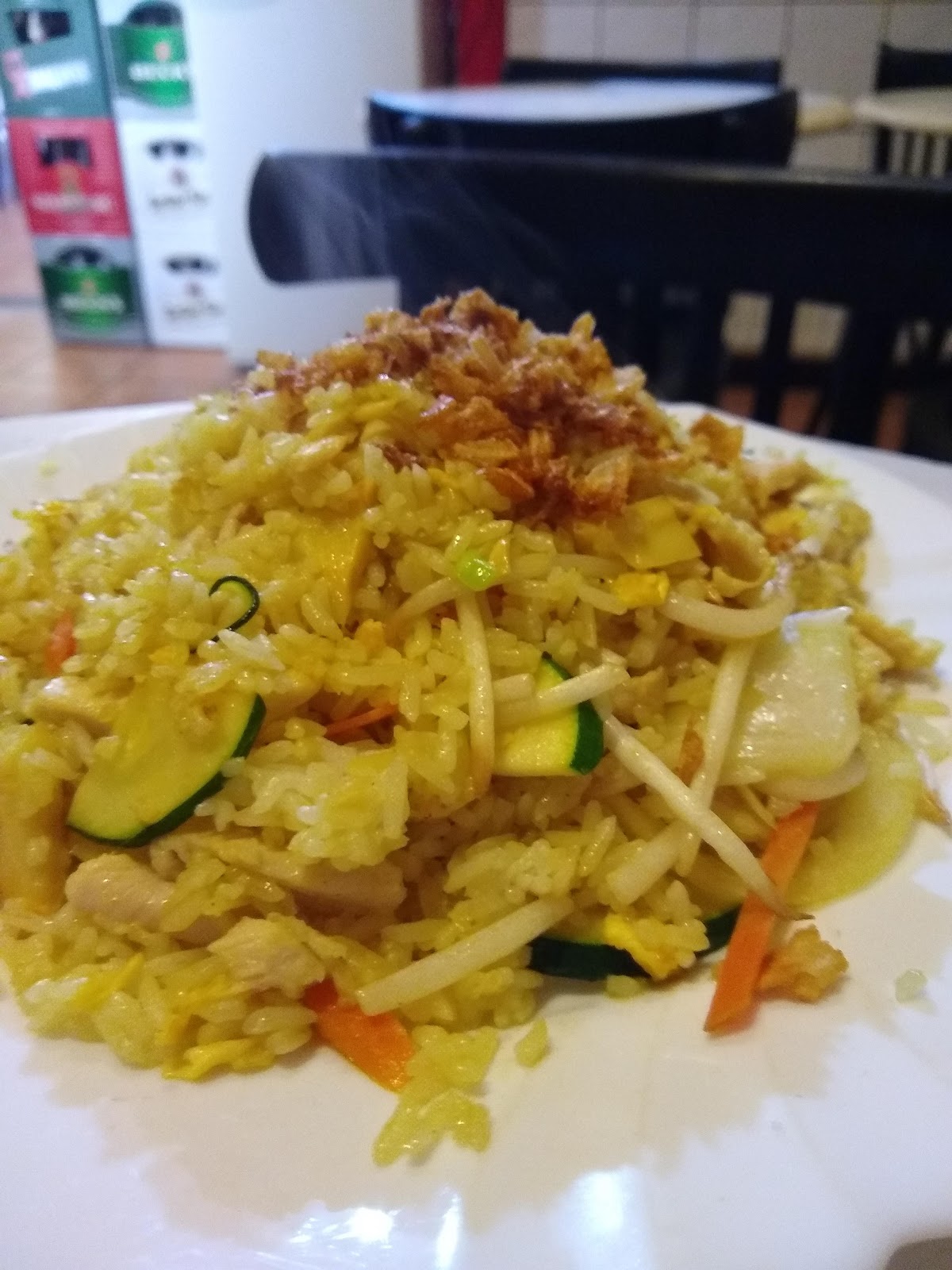 I ordered fried rice with shrimp, and my husband's was fried rice with chicken. We Asians seem to have many dishes with chicken, and having a choice in vegetarian or seafood helps me a lot. The staff told us like they have hot sauce for fried rice but better to eat without it at first anyway as it's really hot.
