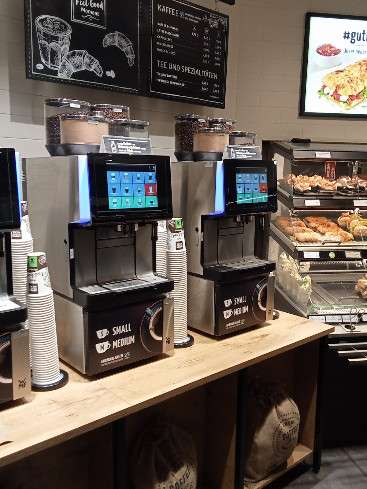 Food was ok, but the cashier was so angry I left the store feeling concerned for her welfare. I didn't know it was possible for someone to be so angry in a circa 20 second transaction. I was left mildly stunned, dare not say anything, quietly paid and long story short, It reached a low point when she chased after me as I walked out the store. She slammed a cup on the worktop that didn't quite break the cup but was sufficiently loud enough for onlookers to stare, pointed at it and shouted "that is a small cup". I was very British about it and simply said I was sorry for picking the wrong cup and left... I'm sure those who work there will know who this was but I didn't catch a name. I just wanted a pleasant day out in Berlin, with my shocked family, with my sandwich and what was apparently a medium cup of coffee..
