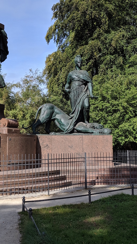 Really imposing statue of Bismarck surrounded by four other characters. We have Atlas or similar considering the globe. We have the scholar similar to the one outside of St Nikolai church and we have the blacksmith forging the sword. Most interestingly we have a woman stamping on the throat of a lion and holding it down. This is very striking for a German statue which Im off to read about. Beautiful surroundings.