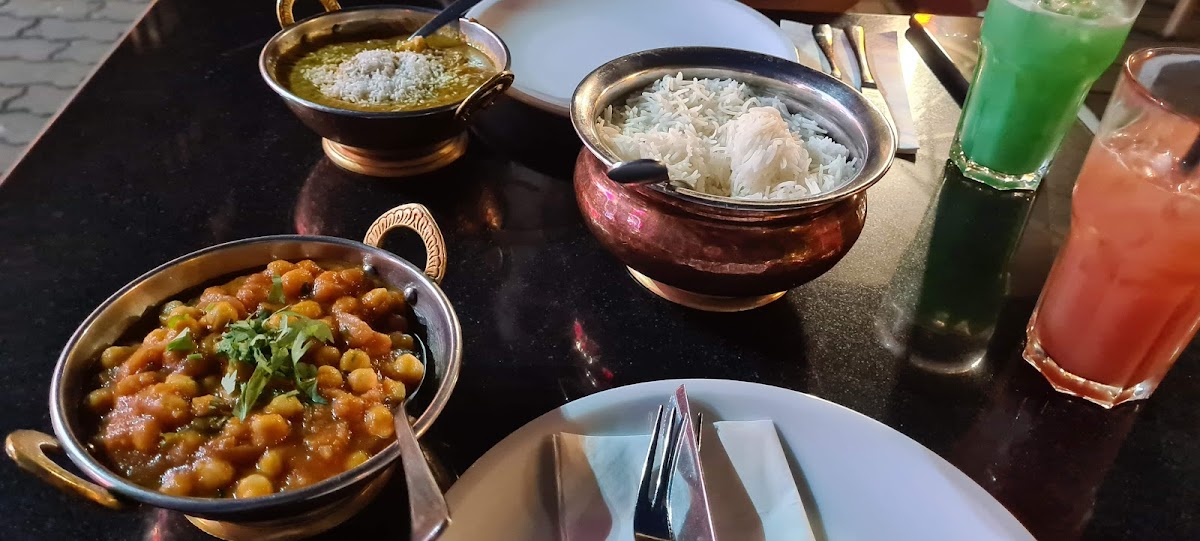 Friendly and efficient staff who served us with a smile. They give complimentary salad. Tasty meals. We got samosa (2 pcs, just forgot to take a picture before starting to eat), chicken curry, chicken tikka masala, mango lassi. Clean restrooms. Great location. We had dinner here before watching Arise. 50 euros plus tip but very full (2 pax)