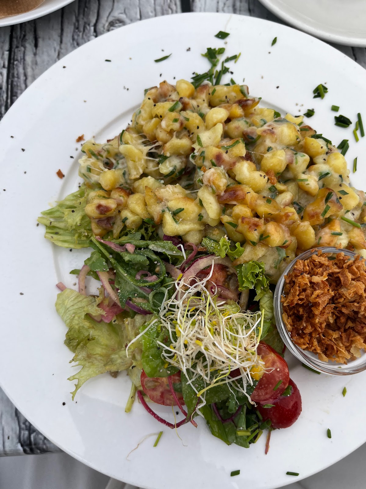 The items ordered were okay Käsespätzle for 10.90€, Bachfisch-Brötchen for 6.80€, an Irish coffee, black regular coffee, and water - 750 mL in size. All the food was about 45€ total… they gave us two of the Käsespätzle although I had only ordered one.