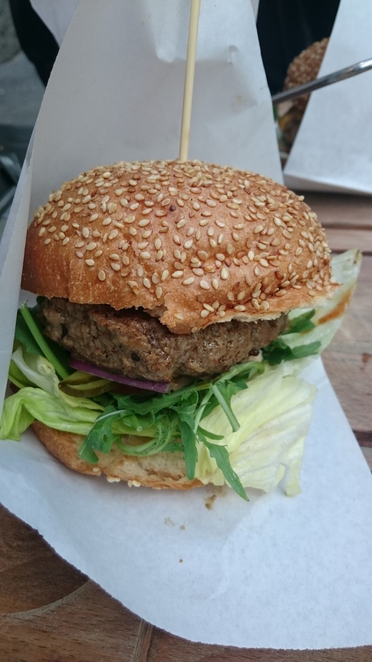 A nice burger place with a large variety of meats and ingredients to choose from. Maybe a bit pricey, but the best choice around the site. We had great sweet potato chips and a small but good krautsalat. Quality ketchup and mayo available too.
