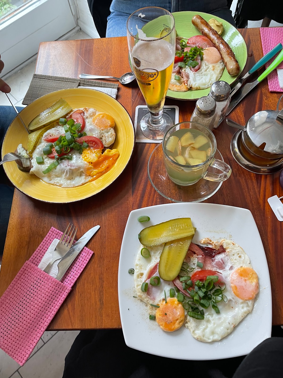 It is a really nice place to have a breakfast Saturday morning. A big Cappuccino was really big (I liked it), food was tasty. They have different “standard ” breakfasts like eggs with something and also cakes. (Under the eggs in Foto is also bread)