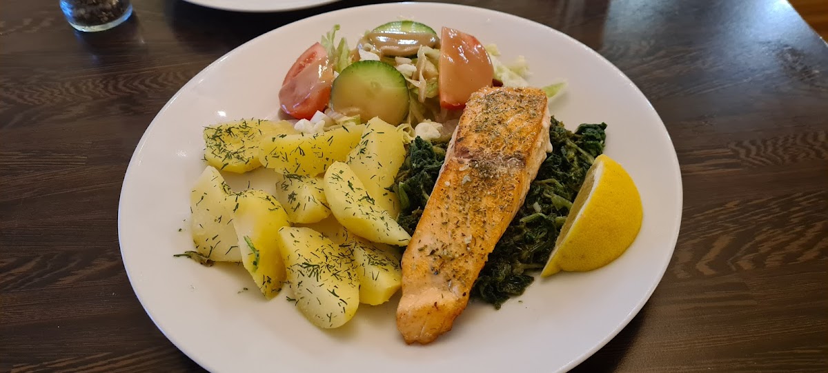 Pumpkin soup and fried salmon were delicious.