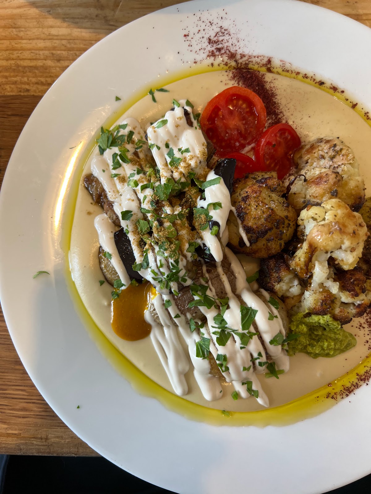 Love this place. Really friendly people. We were put on the waiting list, however, it only took 5 minutes to seat us. The hummus with aubergine and pita was great, really fresh and creamy. Also, the shakshuka was nice, a little bit sweet so could use a bit more spice. As for the cauliflower, great but a bit heavy due to the cream/cheese. Overall, great experience. Note: they only have outside seatings so recommend going with nice weather.