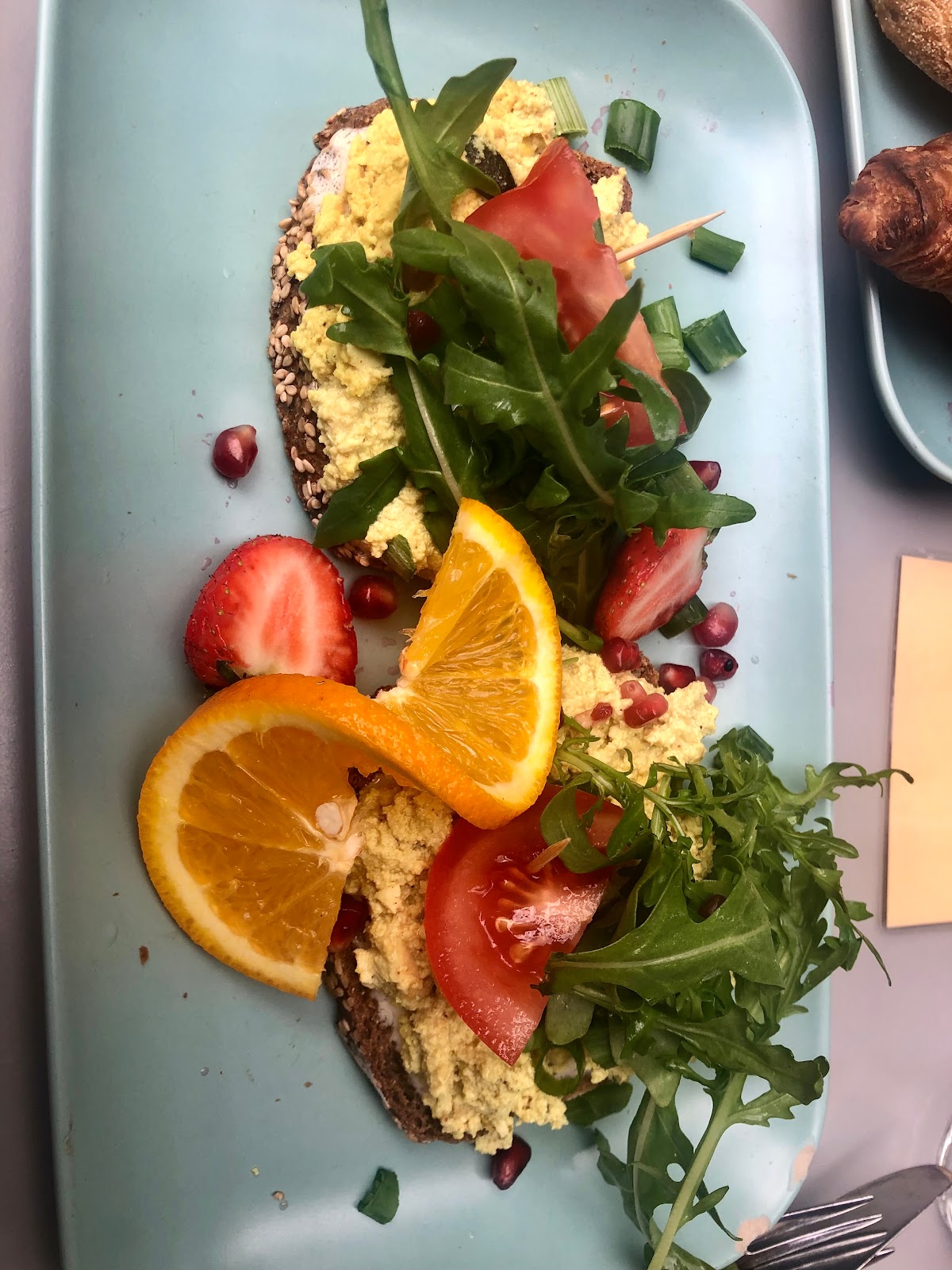 The vegetable flatbread is crispy and the selection for the typical German breakfast is varied (fruit mix, boiled egg, cheese, hummus, tapenade) and served with a basket of fresh bread and croissants.