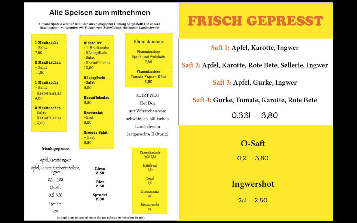 Friendly menu, uncomplicated and delicious food. The broth of the Maultaschen was perfect. It instantly became my comfort food. Will be back soon :)