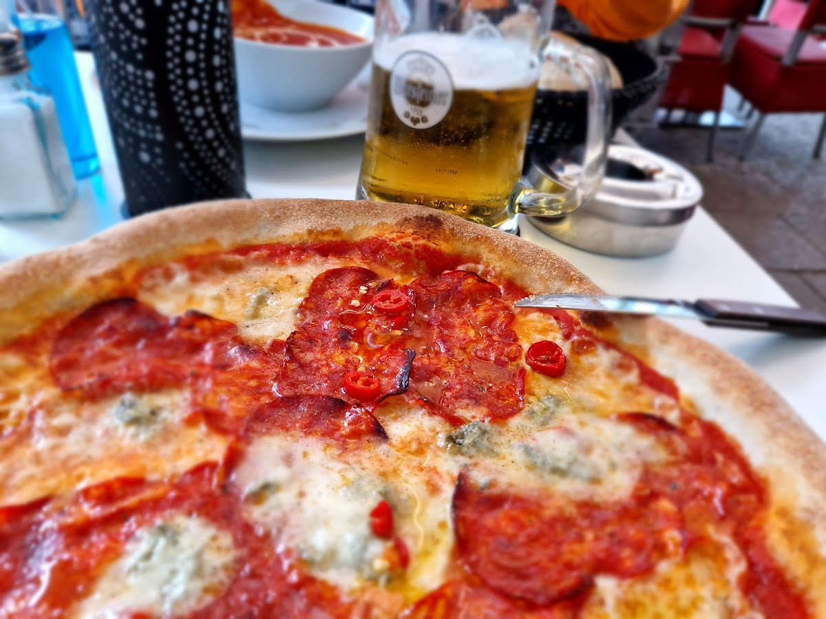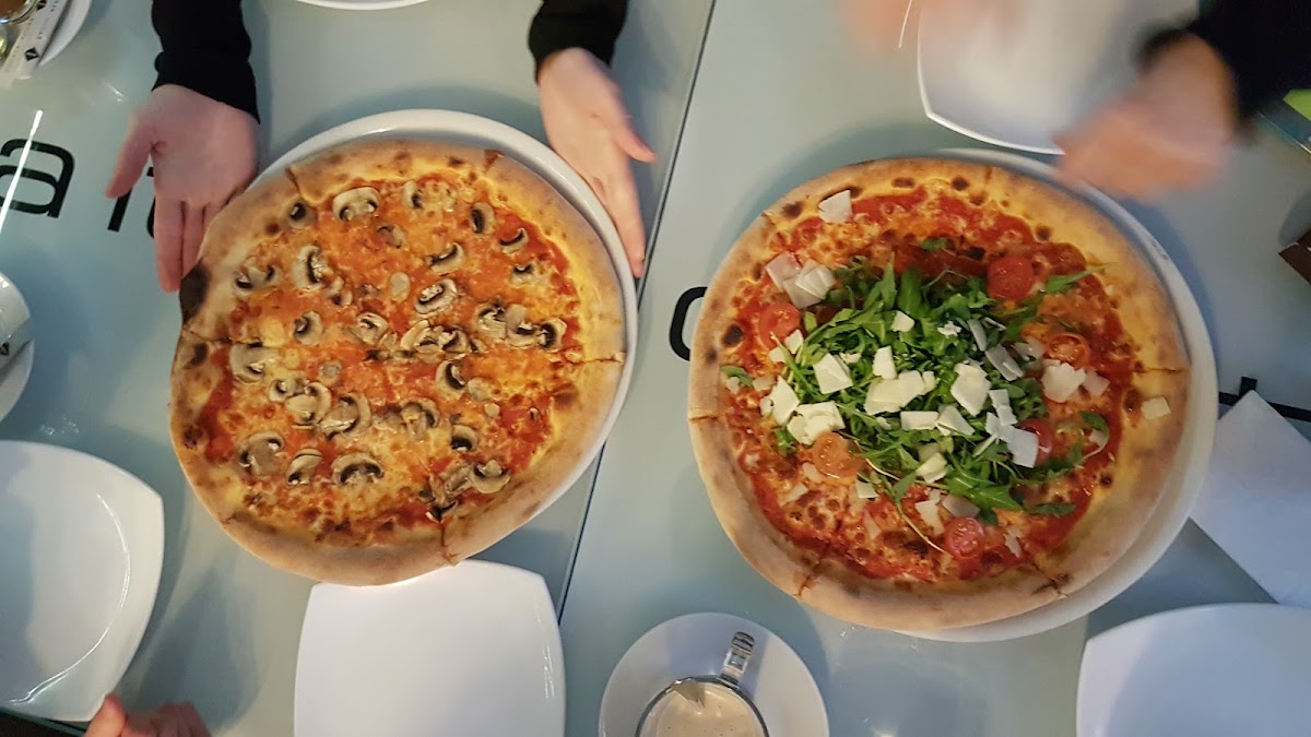 this place transports you right to italy with its folky mediterranean guitar music, black and white photos of italian sights and people eating pasta. there's lots of ice cream on the menu, but we were already freezing so we ordered hot tea and cappuccino with baileys. it came with lots of cream, chocolate sparkles and two extra packs of sugar which one of my sweet friends actually did add for some EXTRA sweetness. our pizza was served with warm plates, what a treat ???? taste was decent, staff quick u0026 friendly, prices okay for mitte.