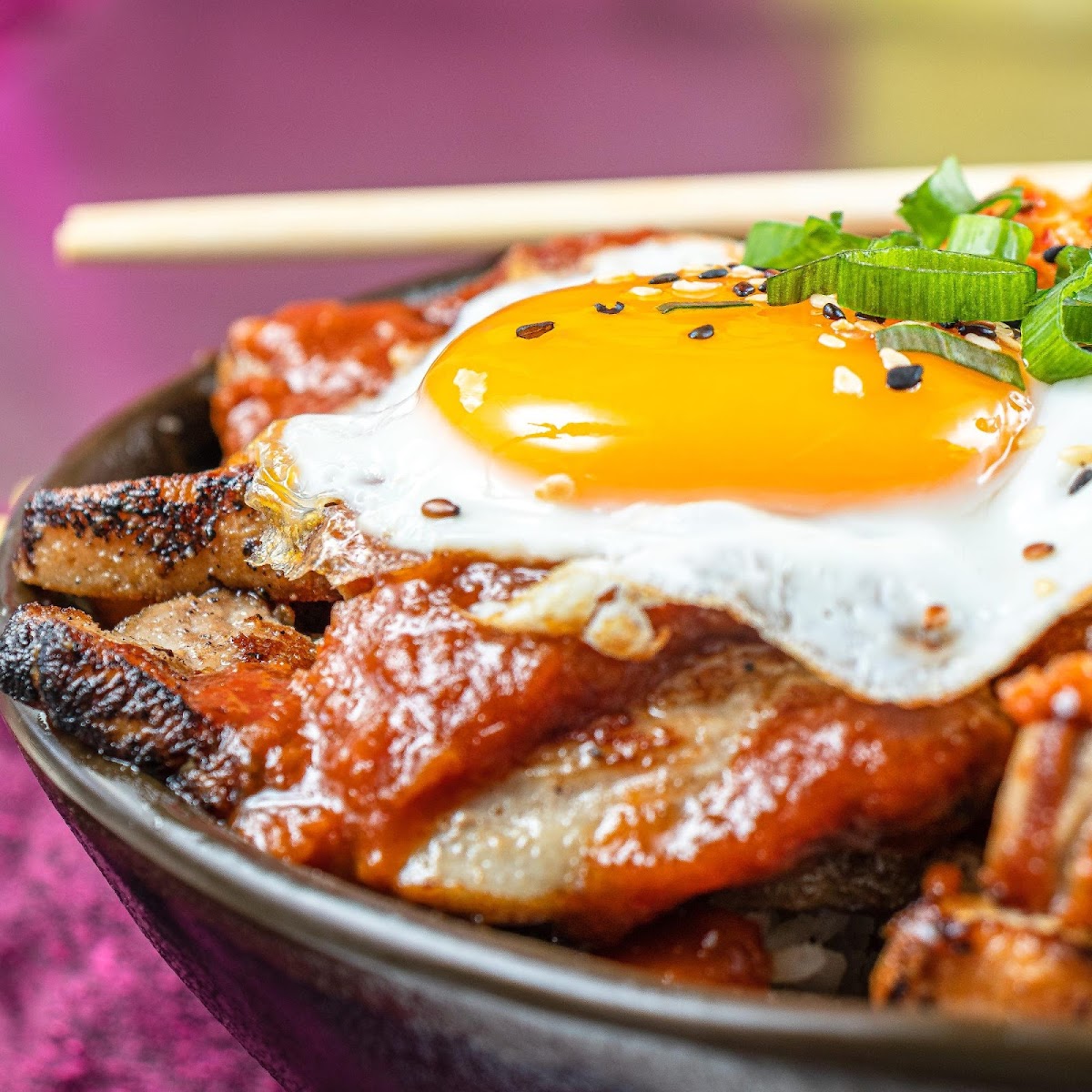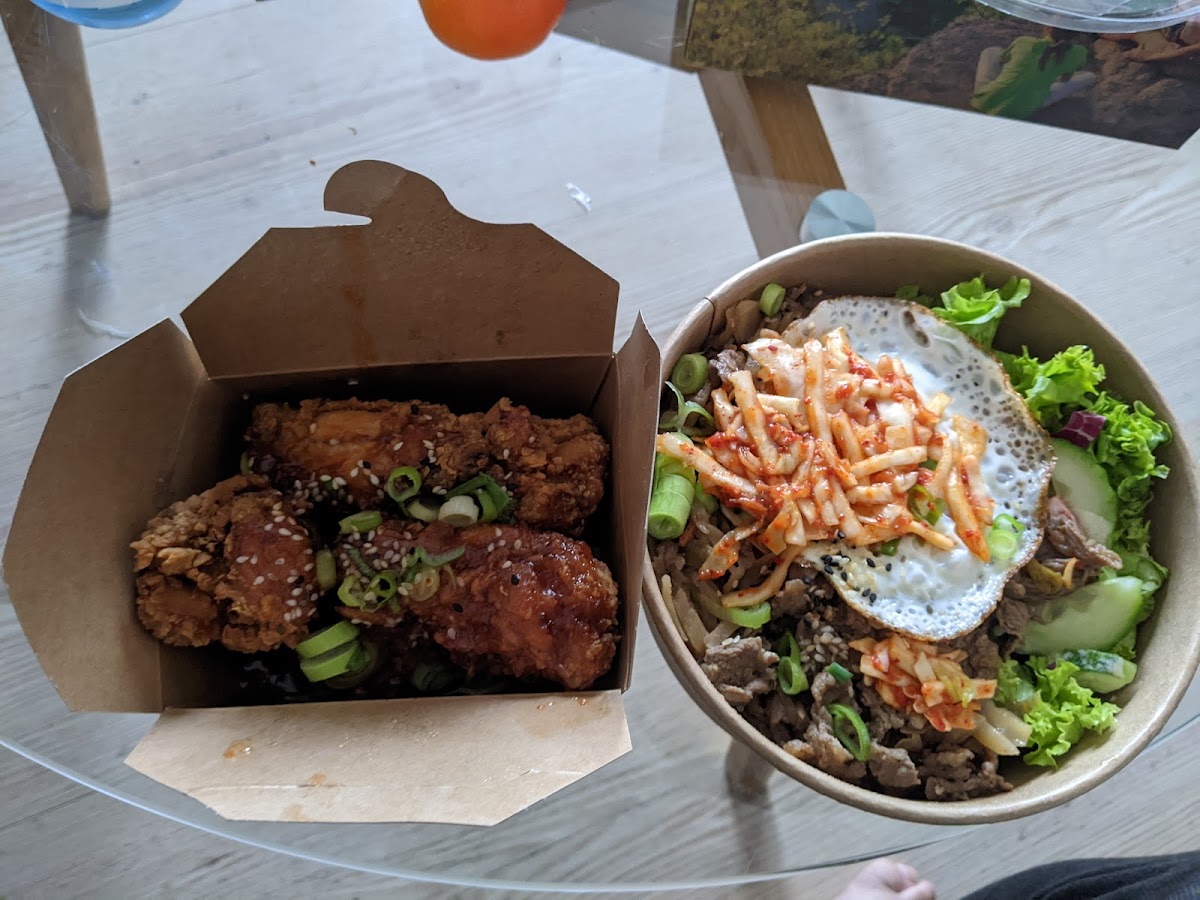 Ended up here just by chance and have been craving the chicken ever since! There aren't many seats outside and no inside seating (when we were there), so space is rather limited. After ordering, it took a while to arrive, but it was worth it! The bowls are quite a big portion, nicely balanced between meat, salad, rice, kimchi,.. My personal favourite was the fried chicken with the honey-butter-garlic sauce.