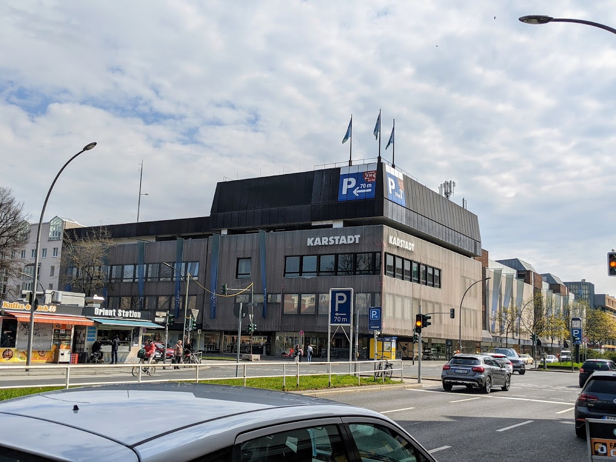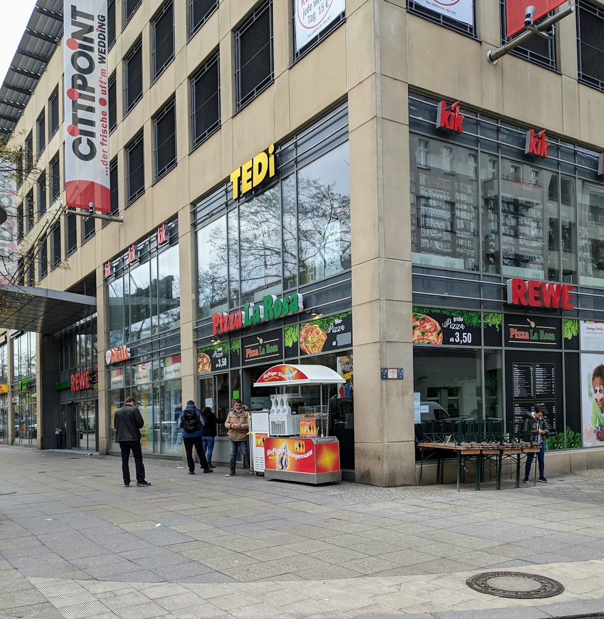 The shops are on three floors (-1, Ground, and 1). The basement has a DHL package station and a Rewe supermarket. The latter is definitely not a flagship store, to say the least.