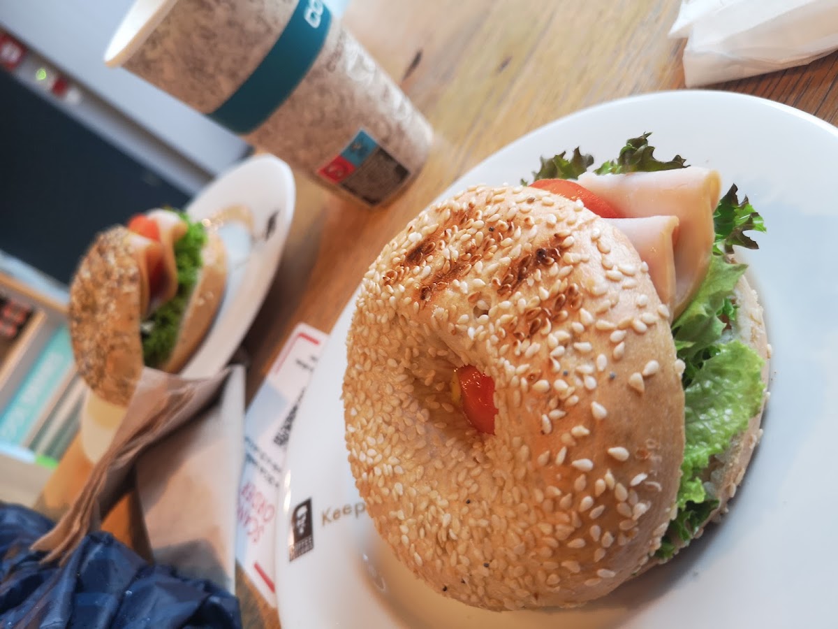 Friendly staff. Clean restrooms. Came here during a 30 min break from a 4 hour walking. Great location. Delicious turkey bagel. Quick service. In and out in less than 20 minutes
