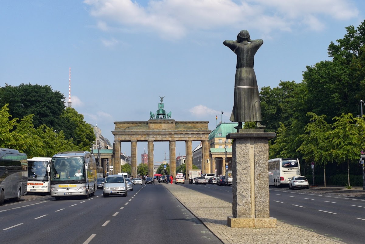 This sculpture stands about 200 metres in front of Brandenburg Gate and is a bronze statue of a woman. The woman is depicted shouting, with her hands next to her mouth. to emphasise that she is calling loudly out to others. On the sides of the base plate is a quote from Petrarca, "I wander through the world and cry peace, peace, peace"