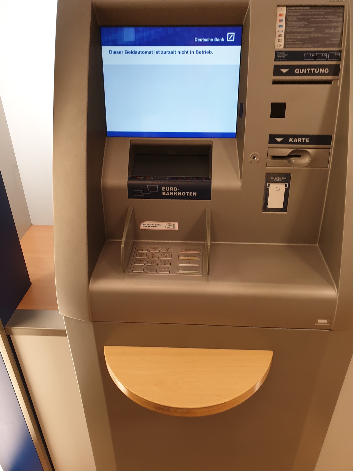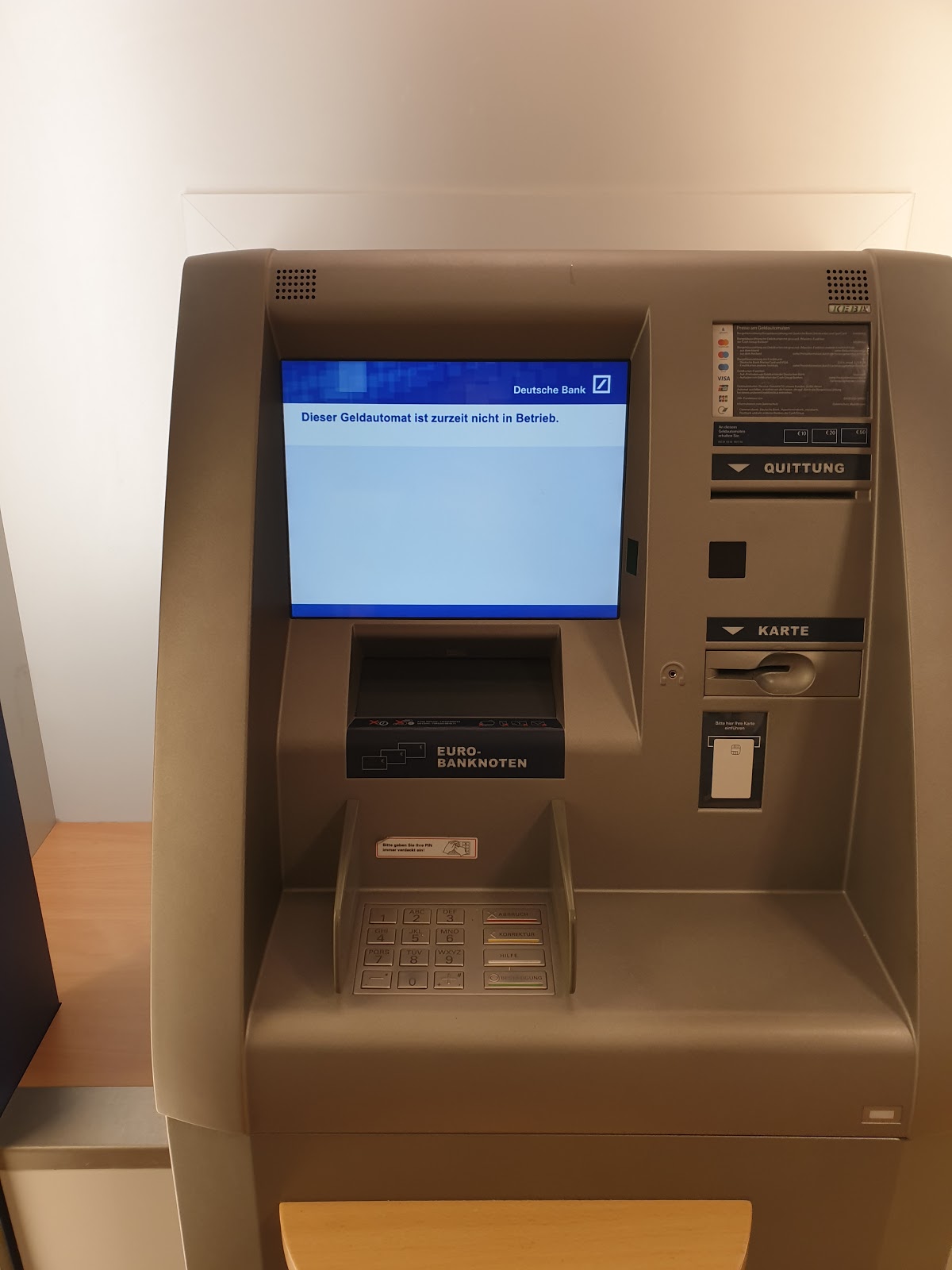 (Translated by Google) Constantly the machine to deposit is broken and there is no second. Each time I have to make a detour of 15 minutes, as other branches were closed. In the last 10 days the machine was here 3 times broken. But that's not just the case in this branch. Everything is made more expensive, branches are closed and the service is underground. The content of a response to a complaint was "analogously" It's just that, we will not change anything and as a customer, you have just had bad luck. Sad as no matter the banks have become the users. Addendum: Thank you for your feedback, but the Deutsche Bank saves on all ends and the costs have to carry only the customers. Then at least put down a second device if they are so vulnerable and if a repair takes longer, I expect a note on the machine. Who will pay me for these useless trips? Shortly after my rating, the machine was already broken. That's just amazing.