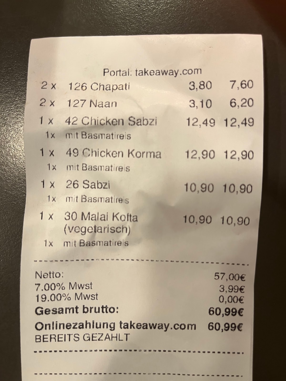See this, who can say this is tandoori roti , bad food i see in berlin , even karahi chicken is to much spices , cant even directly eatable , i have throwed in bin , waste of money a, time and emotions . I suggest you guys plz not order from there