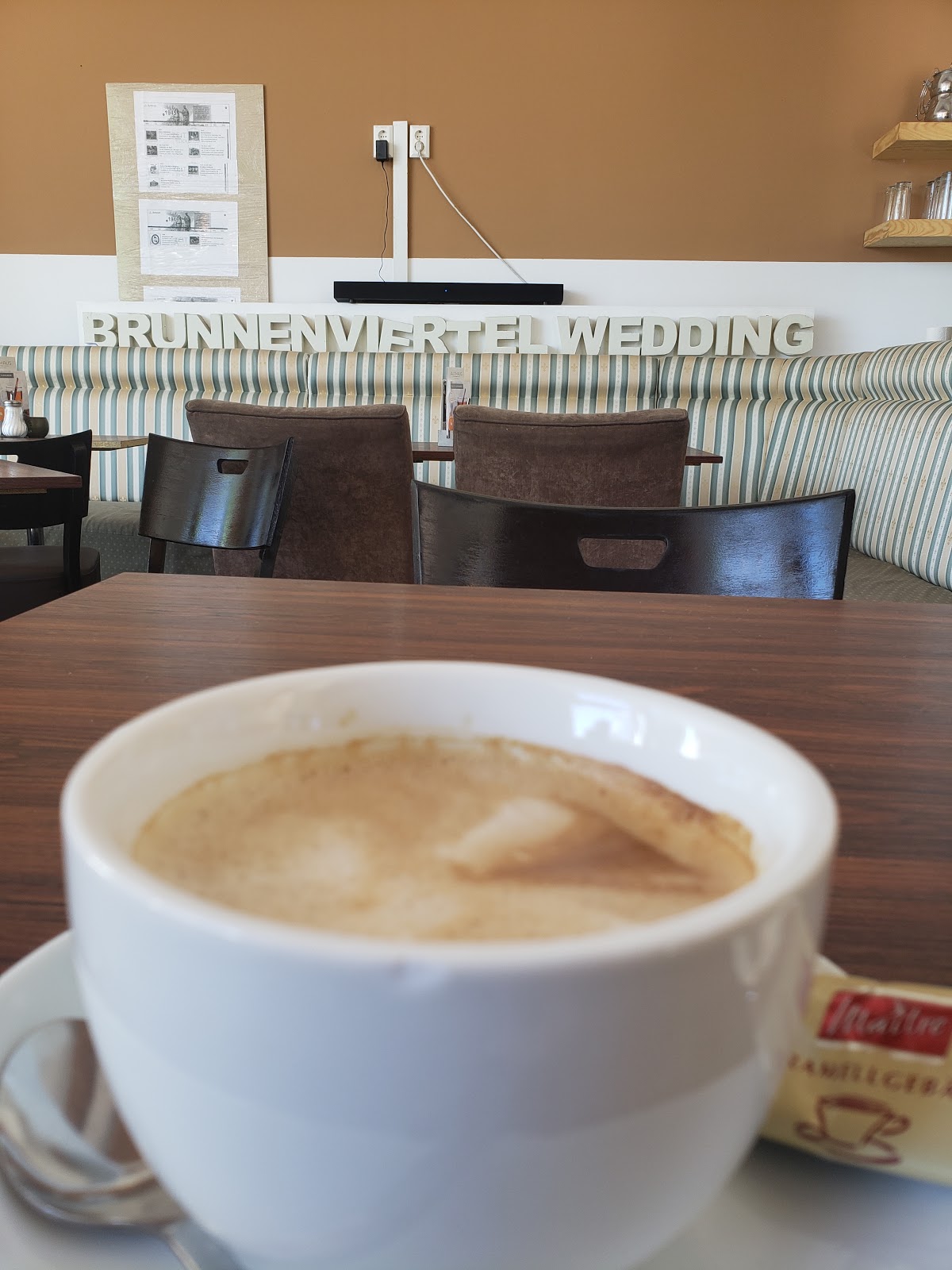 The was a real surprise. The Berliners breakfast was 5 euros 90 and was extremely good. It had 3 types of cheese, grapes, cold meats 2 large seeded bread rolls, butter, jam and honey. The coffee was excellent and the waitress friendly and very helpful.