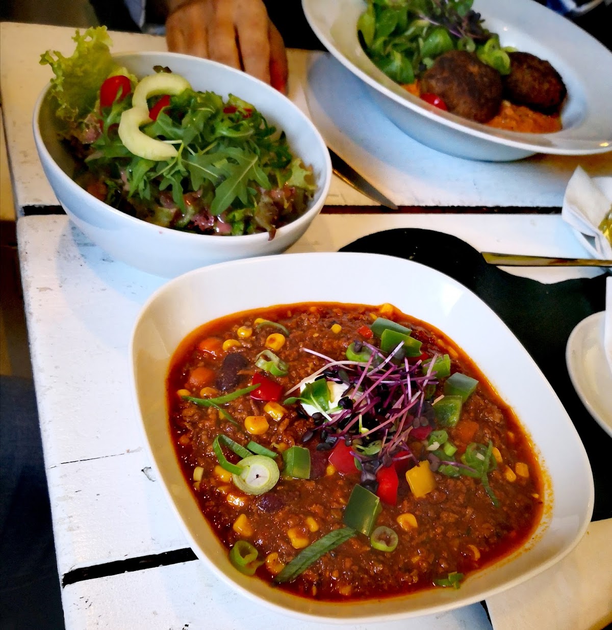 We had meatballs mit mashed potatoes and Salat (13€), Salat with salmon, chilli con Carne and pasta with black olive pesto (8,50€). For drinks minz peppermint tea.