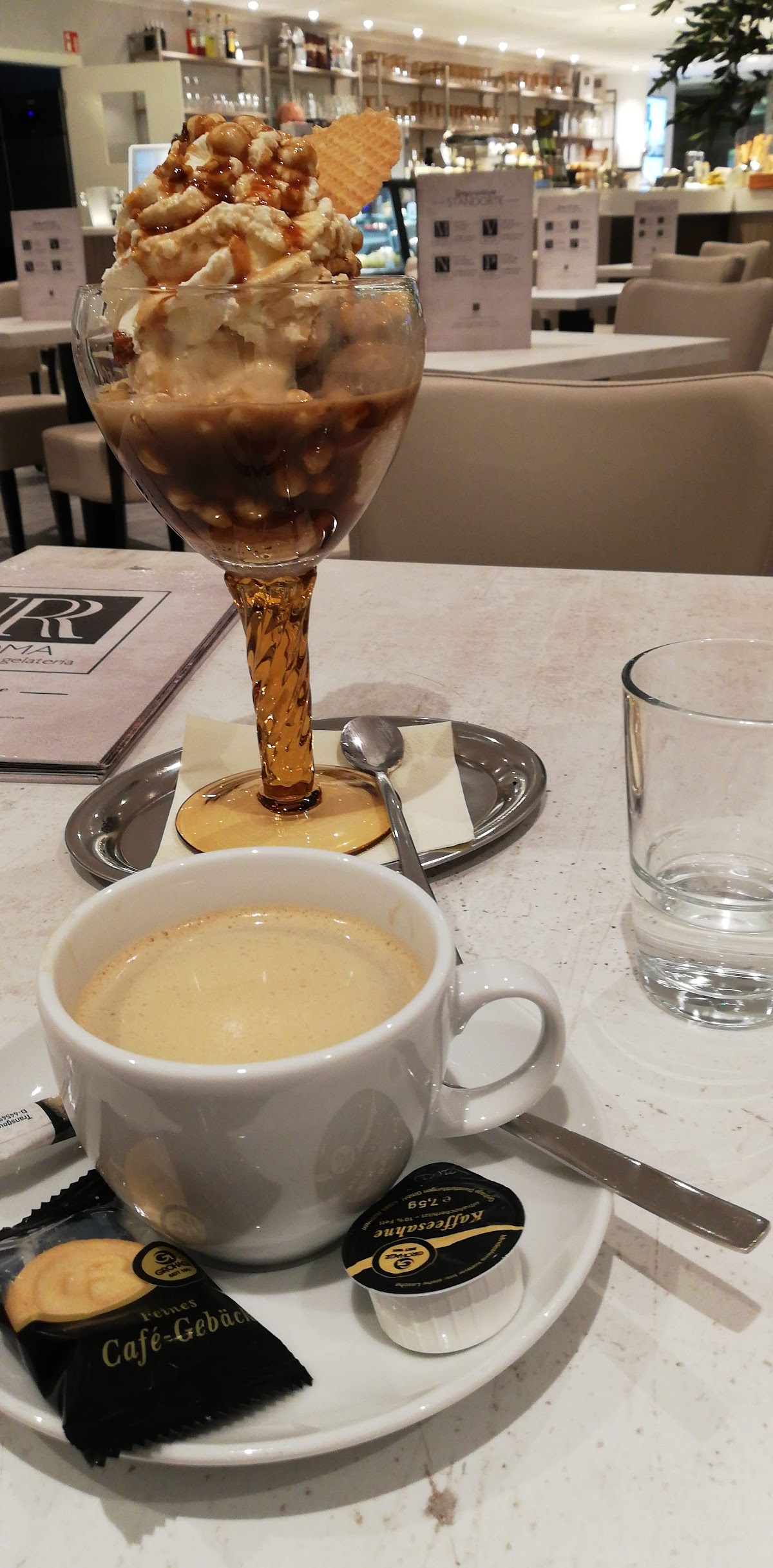 (Translated by Google) I have waited a very long time to find where to go shopping in the Ring Center. Price performance ratio is okay. Is big and cozy. If you had the Sorbe ice cream or what you have, fruit ice cream is too much stretched with milk, you can taste it. That still has to change, but your nutshell with liqueur is very tasty. Wait staff were very nice.
