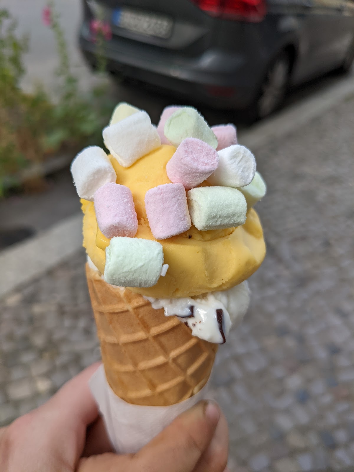Delicious ice cream in a very nice location close to a playground. Staff very kind and spoke in English. We tasted a cone with mango and marshmallows - we loved it.