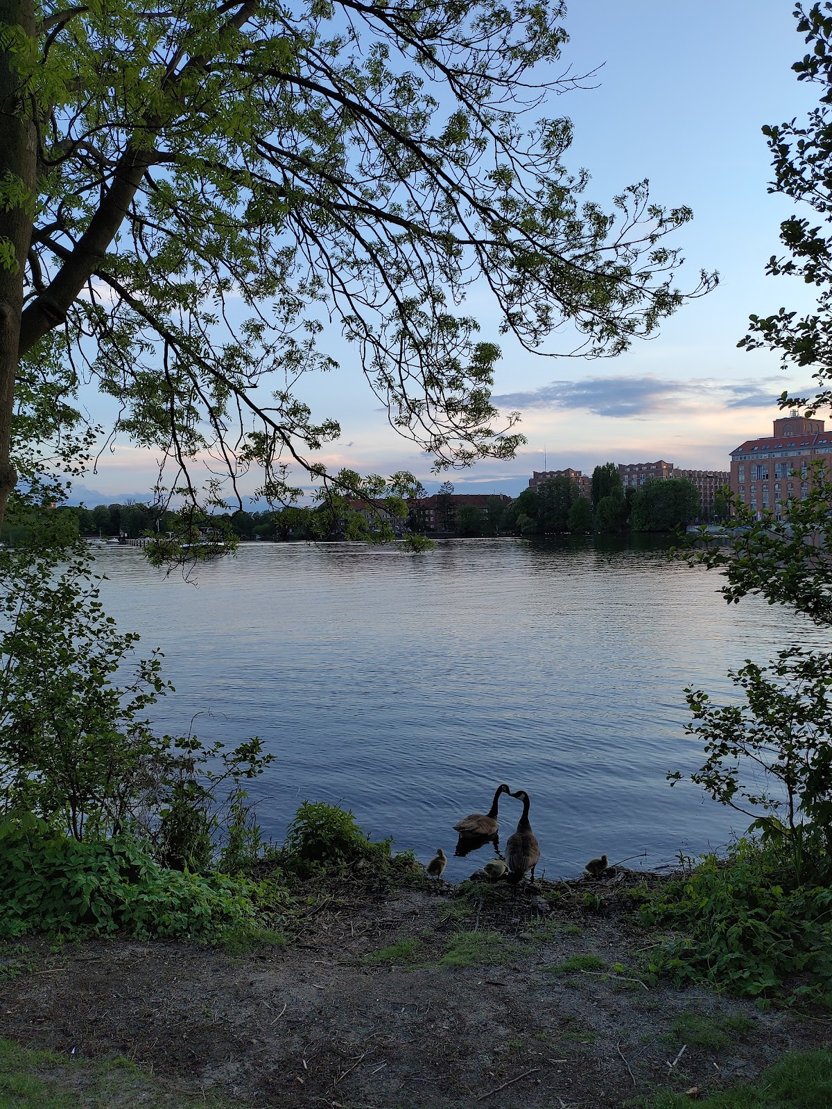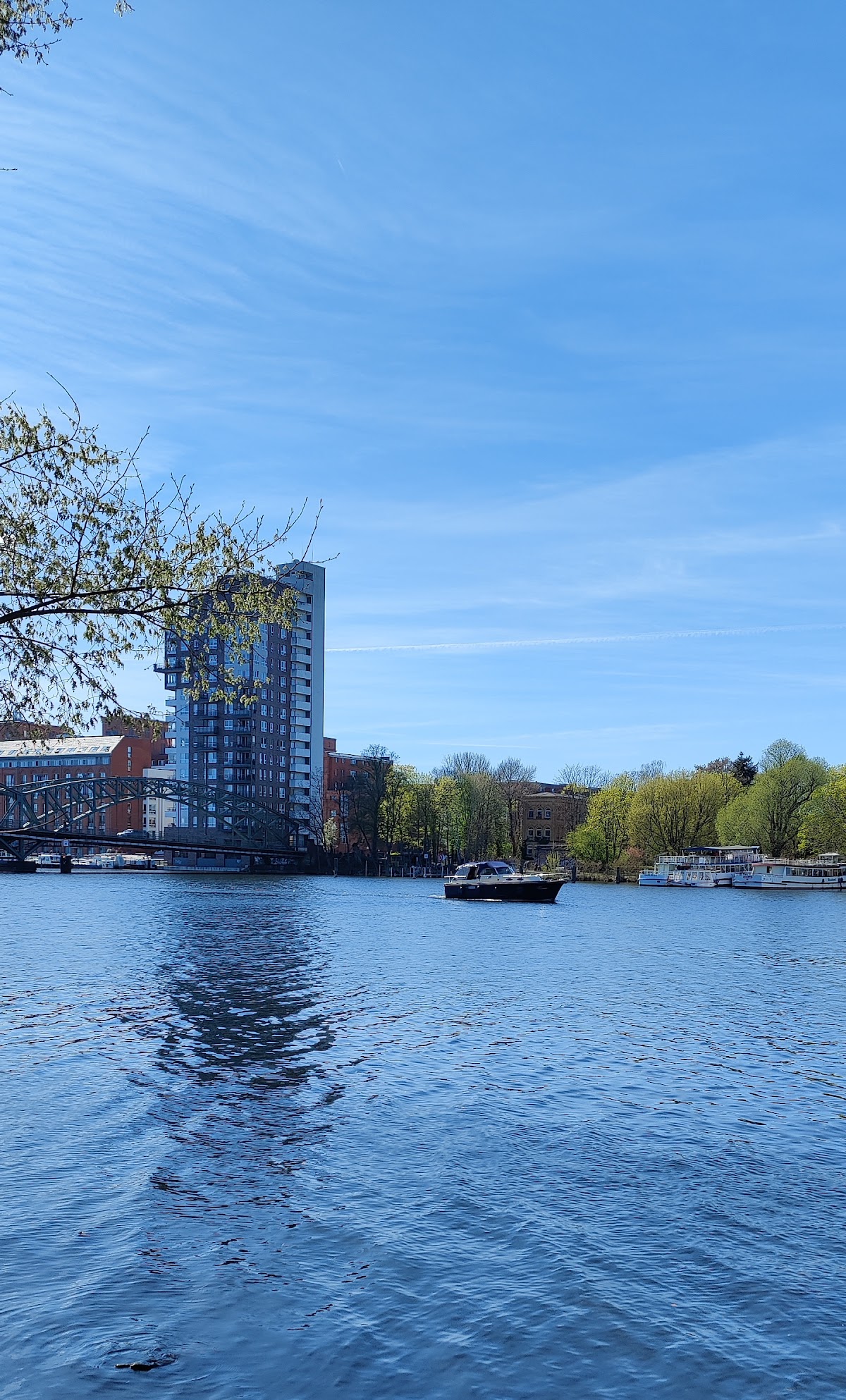 Eine relativ kleine Grünfläche am Wasser mit Blick auf die Eiswerder-Brücke. Auf der gegenüber liegende Seite der Auffahrt zur Brücke werden viele Wohnungen in mehrgeschossigen Gebäude errichtet, zum Teil mit Balkonen und Fenster zum Wasser