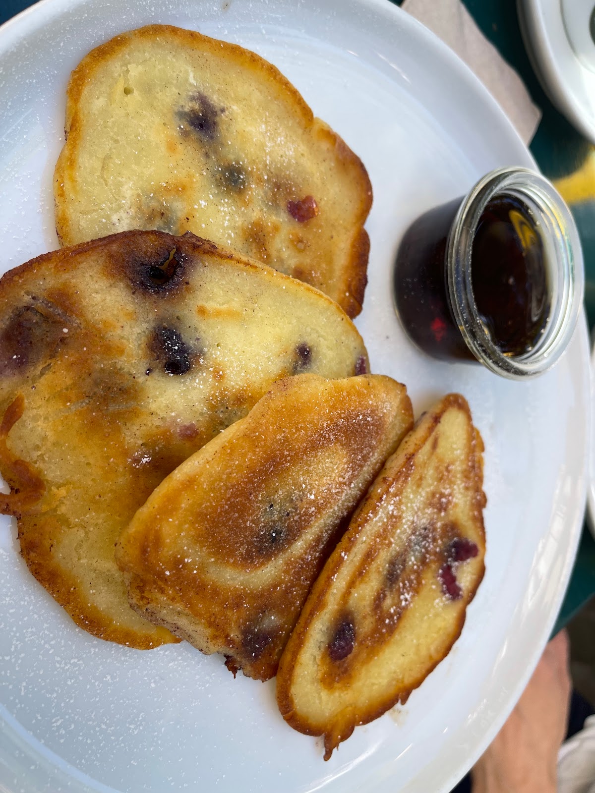 Had the salmon bagel which comes deconstructed so you make your own bites which was fabulous. The salmon is homemade with dill. Also had cream cheese and horseradish which was fabulous. For dessert we shared the blueberry pancakes that were just enough sweet with the tart of the berries. It’s definitely on the expensive side for Berlin meals but worth it!