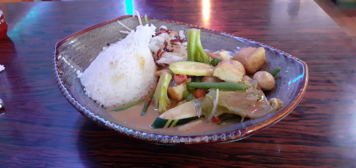 I had a tofu dish with rice and veggies in peanut sauce - delicious. Price are reasonable, lower than in most bars of this kind