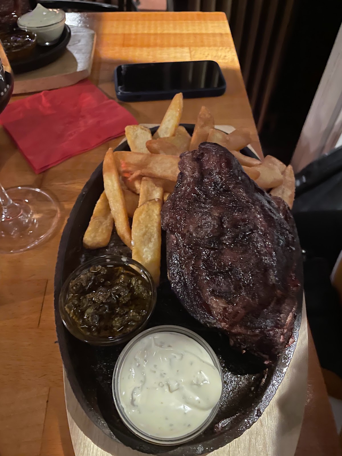 Ribs were stone cold on the inside with chunky unrendered raw fat (see photo) and fries were drowning in grease from the ribs, pretty much inedible. Entrecôte came way too salty and after having to remind the staff that a steak should come with a ‚how would you like it done?‘ it arrived medium well anyway, which was not what we ordered. The toilets smell like a gas station toilet, I recommend you don’t use them before you eat. Unfortunately not a great experience over all, I hope there will be more attention maybe towards meat prep quality in the future.