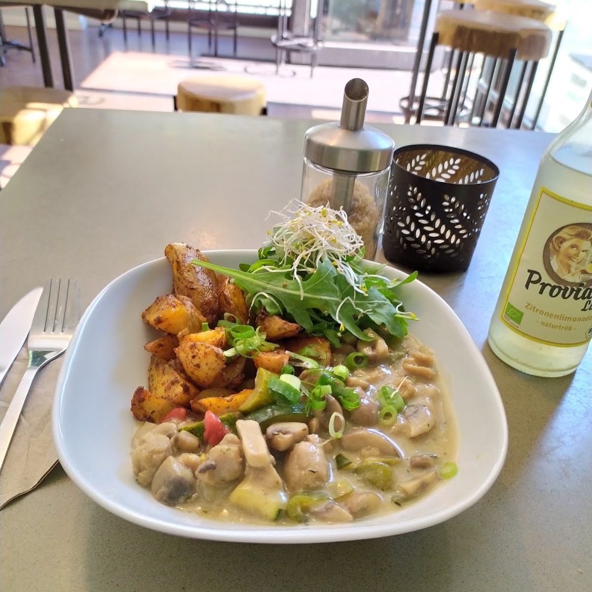 Vegan restaurant near the Spree, organic, delicious food and lovely service, cozy modern interior, variety of food inside, restroom available.