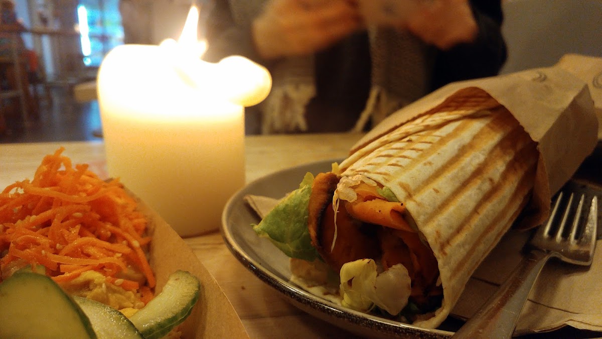 (Translated by Google) My new favorite snack! I am very happy about the new opening and enjoy your meal. Gustav Grün offers great vegetarian / vegan dishes. Your wraps are extremely tasty and you have a good selection of hummus and sauces. For new customers: be sure to order a wrap with avocado hummus, corn, yogurt mint sauce and wedges. The wraps are very large and fill you up and cost only € 5.80. The falafel were also very crispy and went well with the date u0026 fig hummus.