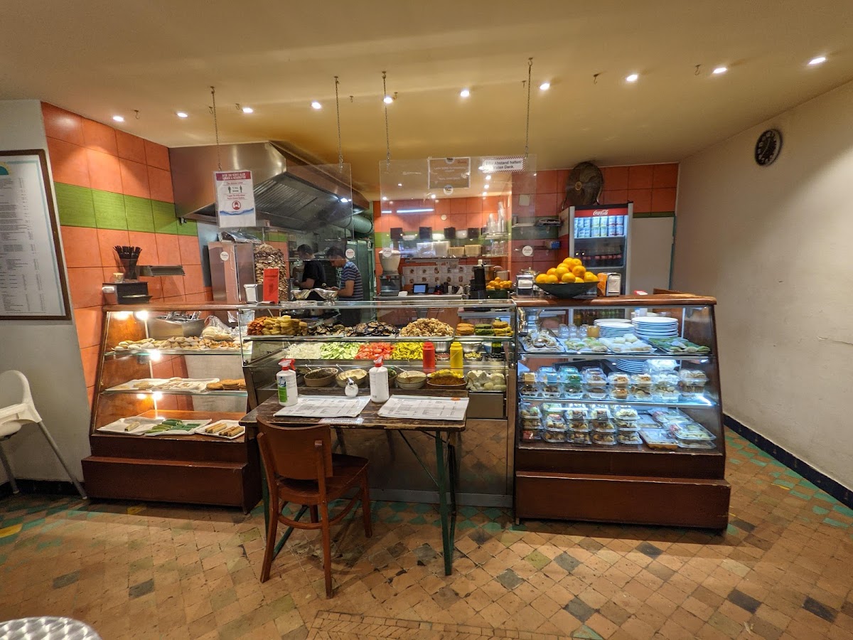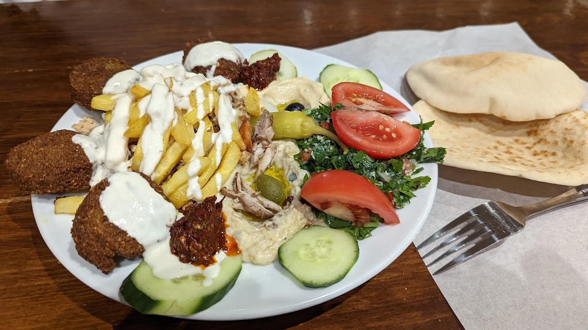 Falafel sandwich in a pita pocket with very fresh falafel balls, cucumber, onion, tomato, pickled chili, and garlic sauce . Satisfying but while the Falafel had a great crust and an perfectly textured interior, it seemed very salty leading to a one star deduction.