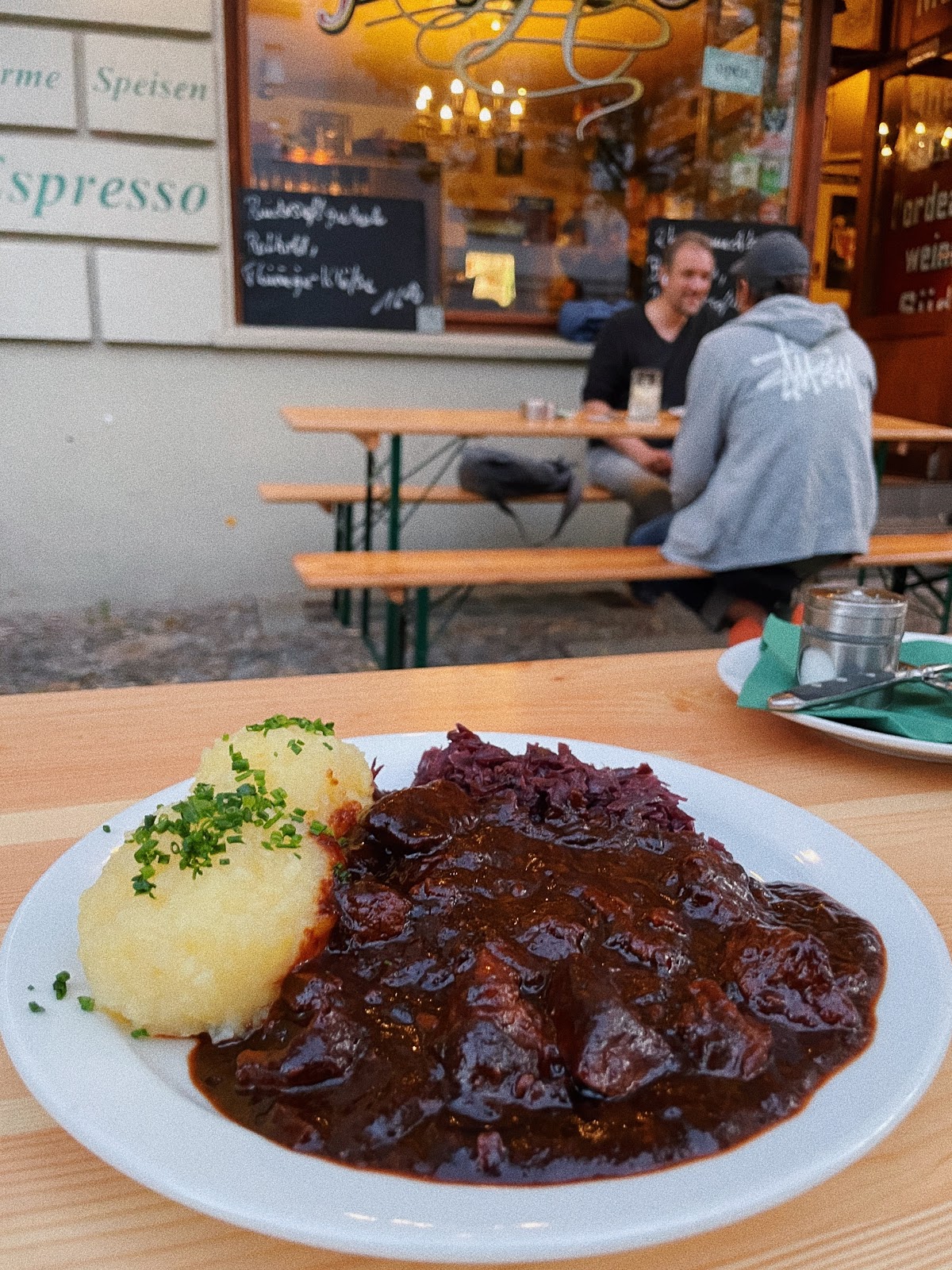 Pleasant neighborhood place and no tourists (besides my table), with authentic German food. Fair price and waiter spoke good English, while being timely and attentive, very pleasant service. I had a very perfect tender pork knuckle (cured in-house), with mashed potato and sauerkraut, and a 0.5L of their own unique lager. Others at my table enjoyed the pork medallion and rouladen as well. One of us had ice cream with berry sauce and was nice, another had strudel which was good but said it was slightly bland. I finished with a czech raspberry brandy. Will need to go back here if I'm back in Berlin!