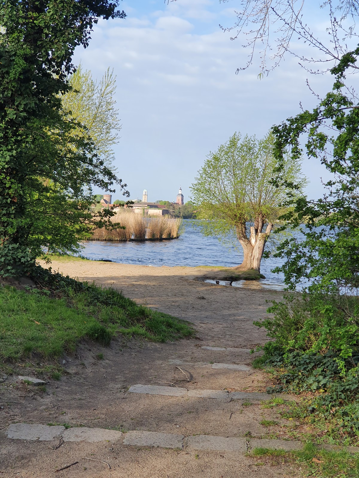 Schöner kleiner Strand mit sehr schöner Aussicht auf die Havel samt Zitadelle und der Innenstadt Spandau.