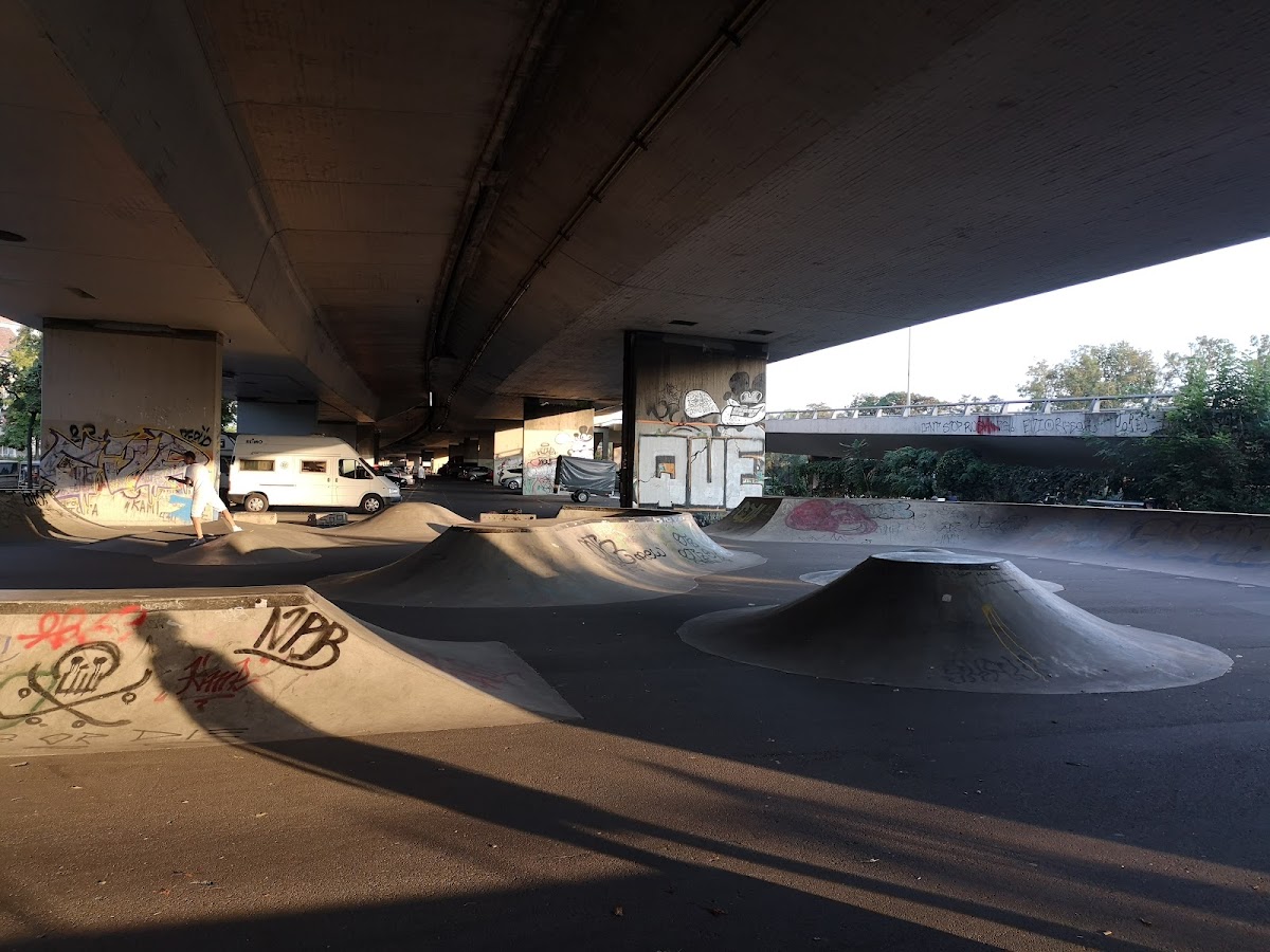 The small park has definitely seen better times a bit run down, close to a motorway and BSR. Still some restaurants and snacks close by. A really nice Spätkauf offering home made food and cakes. Three supermarkets, Aldi, Netto and a Russian supermarket just on the other side of the road. S-Bahn, U-Bahn and busses.