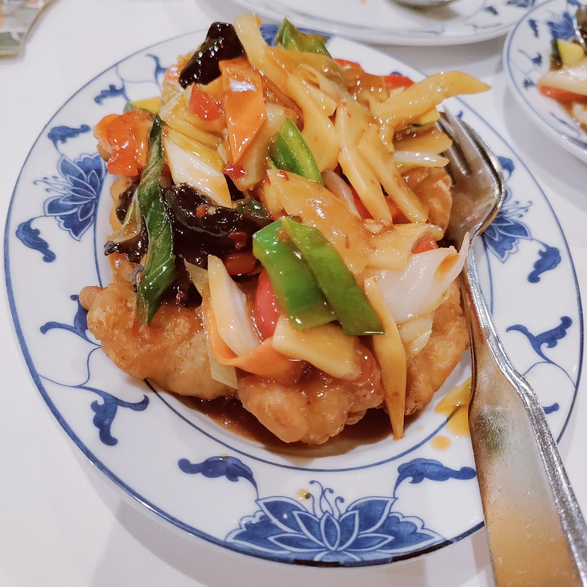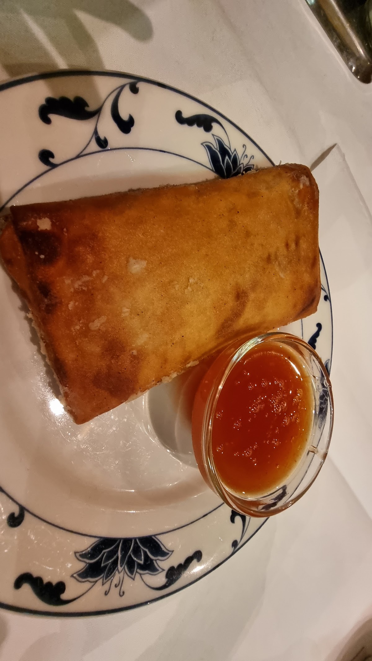 Hot and sour soup, with Spring Rolls, Pork Momos, Fish with vegetables, Squid in Oyster Sauce.