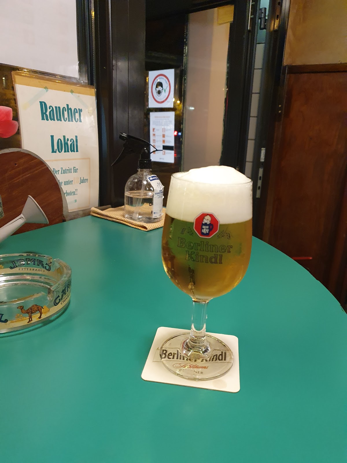 (Translated by Google) "Anyone who offends the landlady will be hanged." With this saying behind the counter, the guest is received in the Holsten-Eck. The smoking bar has three small tables (and chairs) in front of the door, but the inside is rather clear in terms of space. Curtains cover the windows, artificial flowers cover the window sills and tables, tiles cover the floor and wooden panels cover the ceiling. At the bar Kindl on tap at reasonable prices. There is also bottled beer. Corona rules are demanded - with grumbling and not entirely according to regulations - and the data obtained. The service is more brittle than cordial, but you know that from Berliners. International hits from the 80s play in the background. It's not easy to get really warm here ...