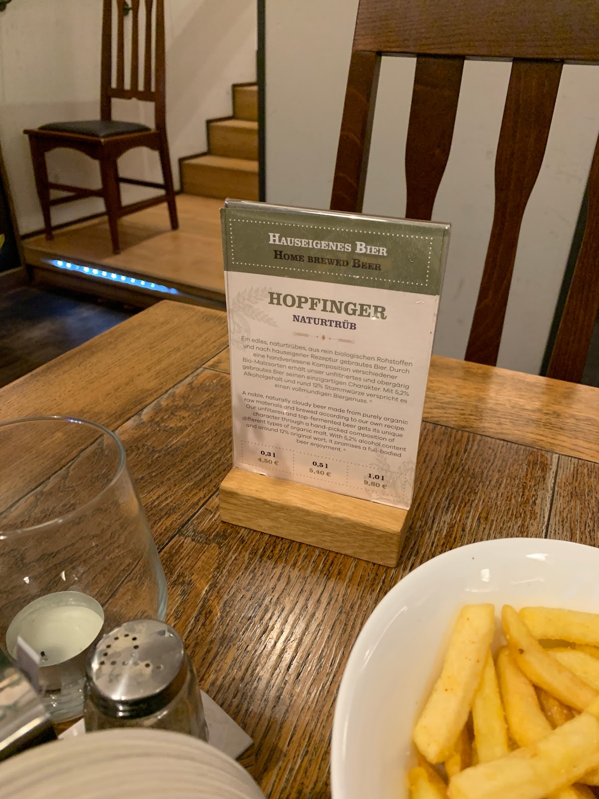 Would highly recommend if you wanna get a good flight of beers with a view of the gate. Good variety on tap and you can get a meter flight (good enough to share for two) and try a variety of different german style beers. Fries make a great beer snack too. Friendly staff and they always appreciate if you try to speak German!