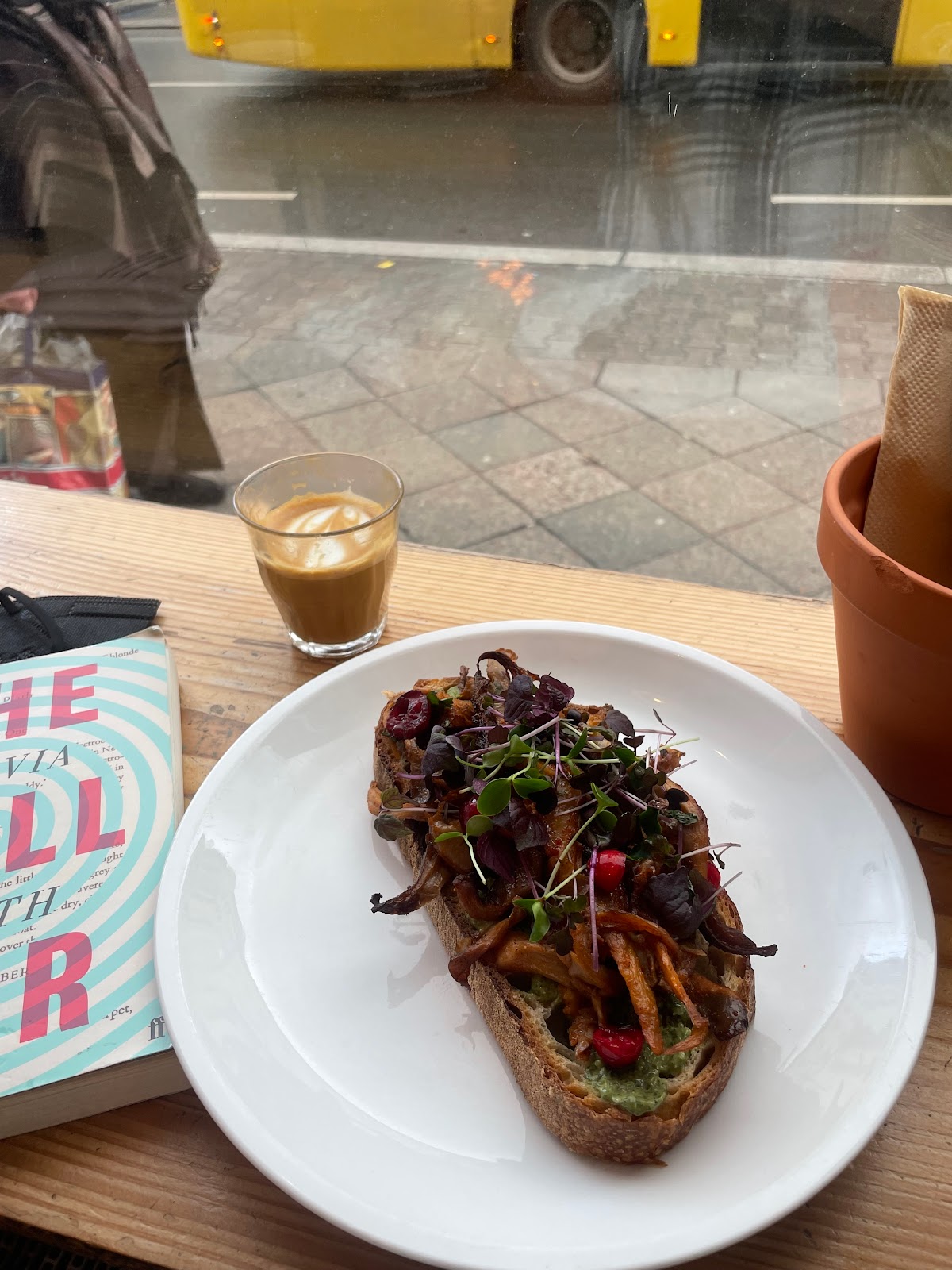 I came here three different times while visiting Berlin. Staff is very friendly. On the third visit we sat down for breakfast, and I was beyond impressed with the food. So not skip the mushroom Mushrooms on Toast. The Kimcheese sandwich was also amazing. Very cute and simple indoor space.