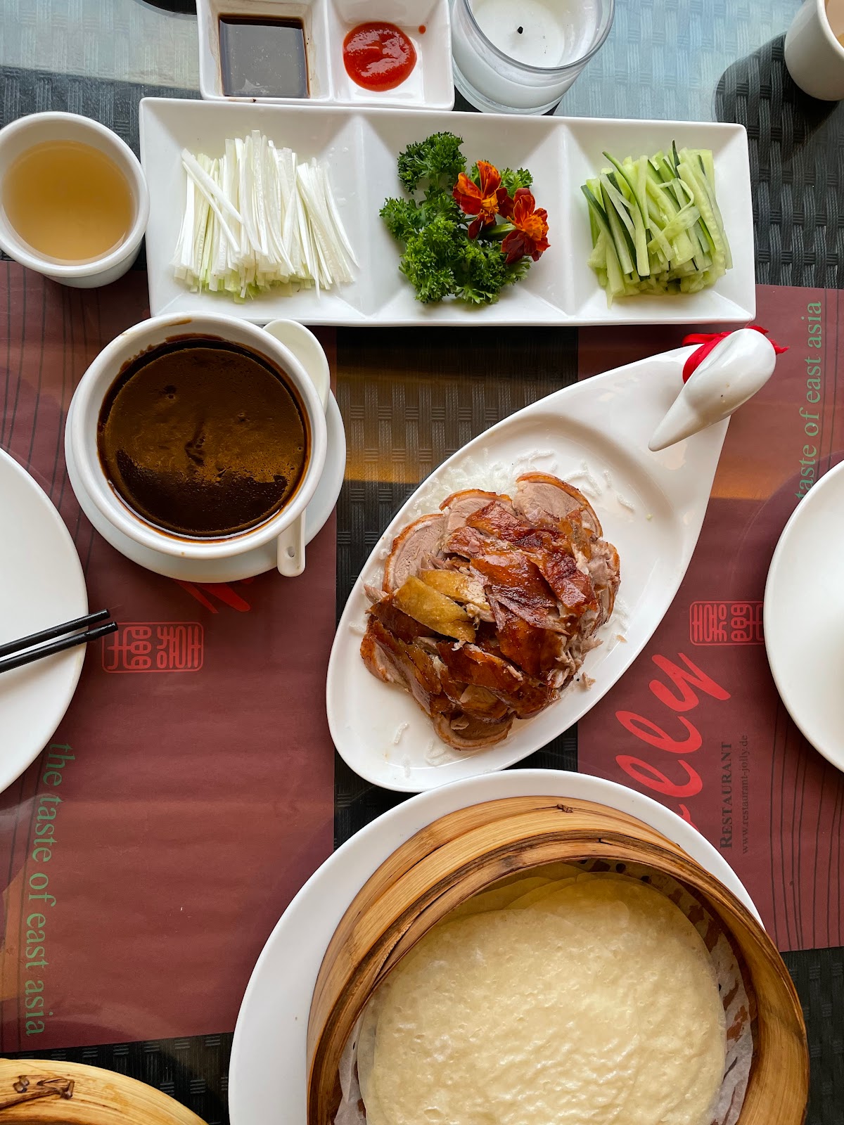 Fantastic authentic Peking duck ???? with freshly made pancakes wrappers!! Must try if you are a duck fan and in search for real Chinese Peking duck. Best duck I had due a long time across many countries including United States ???????? laces like new you’re or San Francisco. The fresh ginger tea was really nice and yummy shrimp dumplings as well as hollow Chinese vegetables with garlic sauce. Must visit in Berlin if you like Chinese Peking duck. Price us a bit higher than bit than Asian places but worth it???????? with Peking duck???? (outdoor seating is also available with even blankets to keep you warm. Very thoughtful ☺️)