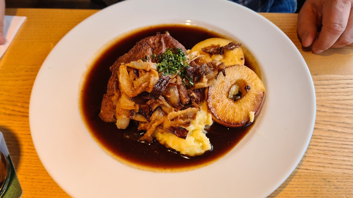 The food was good and we didn’t have too wait too long get served. The place is located in a shopping center and accessible via the street. The waiter was nice and the decoration is German style. Our table was next to a heater and it was way too hot. It wasn’t that pleasant