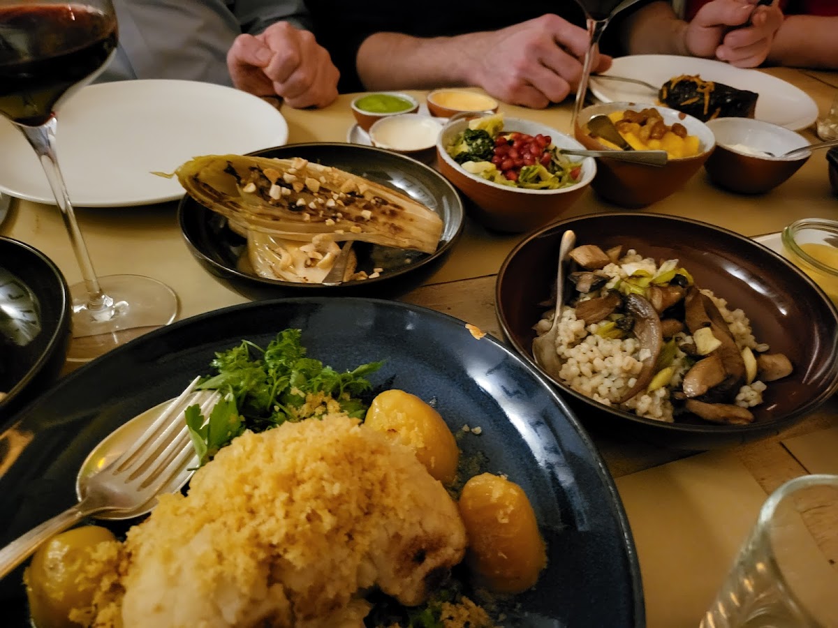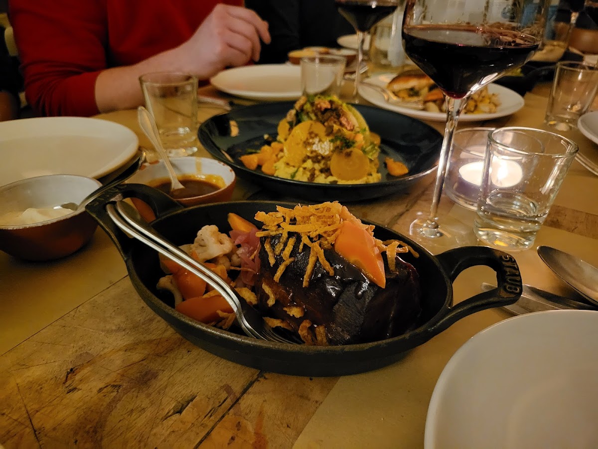 Main dishes follows fast with outstanding veggie cauliflower with nuts and a mix of superb dips and my roasted pork and savoy cabbage was simply heavenly, everything crowned with a beautiful austrian wine.