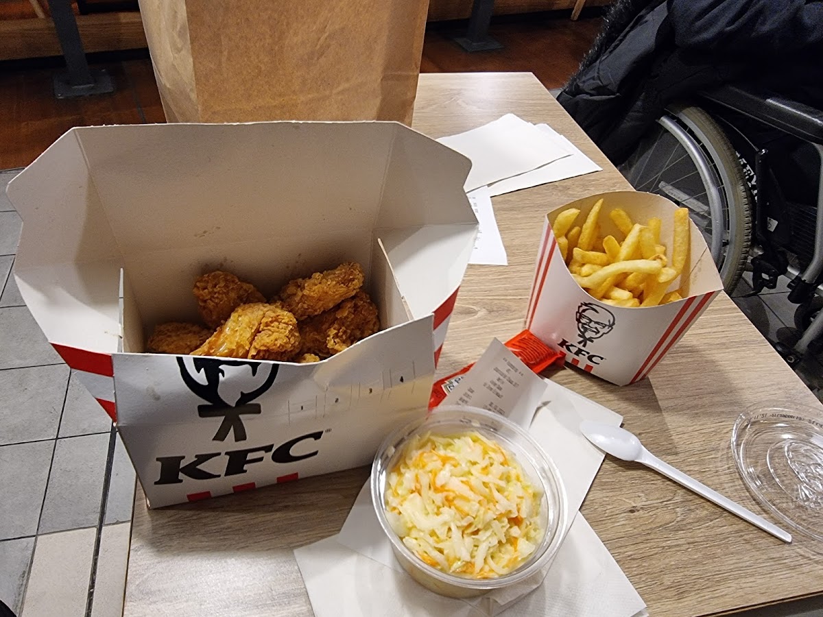 Had KFC for lunch at work and it was amazing. Tasty batter, fresh chicken and friendly service for a huge order which is rare in the fast food service. I've eaten at a lot of KFCs and this was solid, but not spectacular like other locations around the world and I'll need to test consistency before bumping the stars to 5.