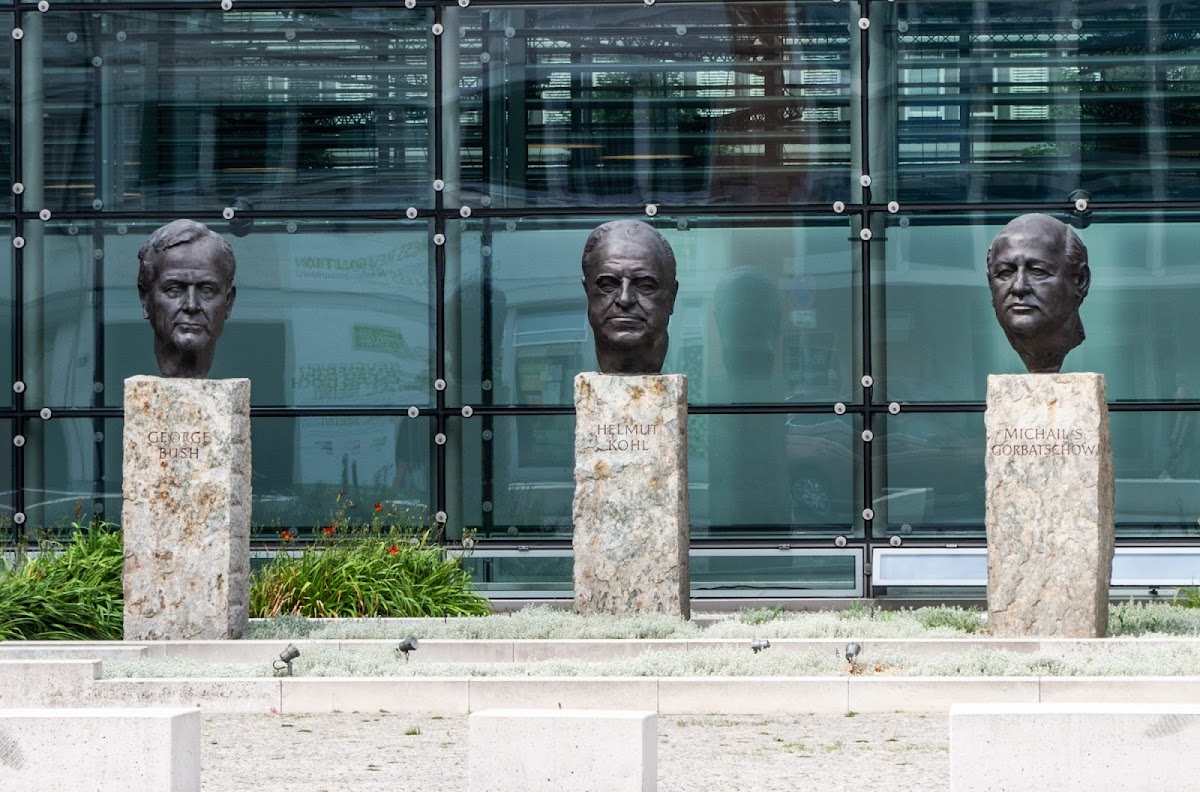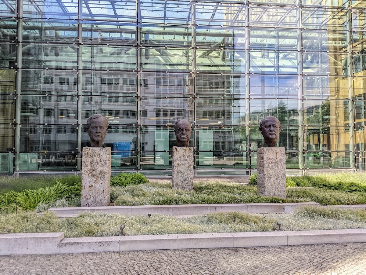 Die Bronzeköpfe der "Väter der Einheit" - jedenfalls, wen der Axel-Springer-Verlag dafür hält - stehen etwas unmotiviert in einer Einbuchtung am Verlagsgebäude. Ungeachtet der historischen Verdienste - wegen seiner Gestaltung muss man diesen Ort nicht extra besuchen.