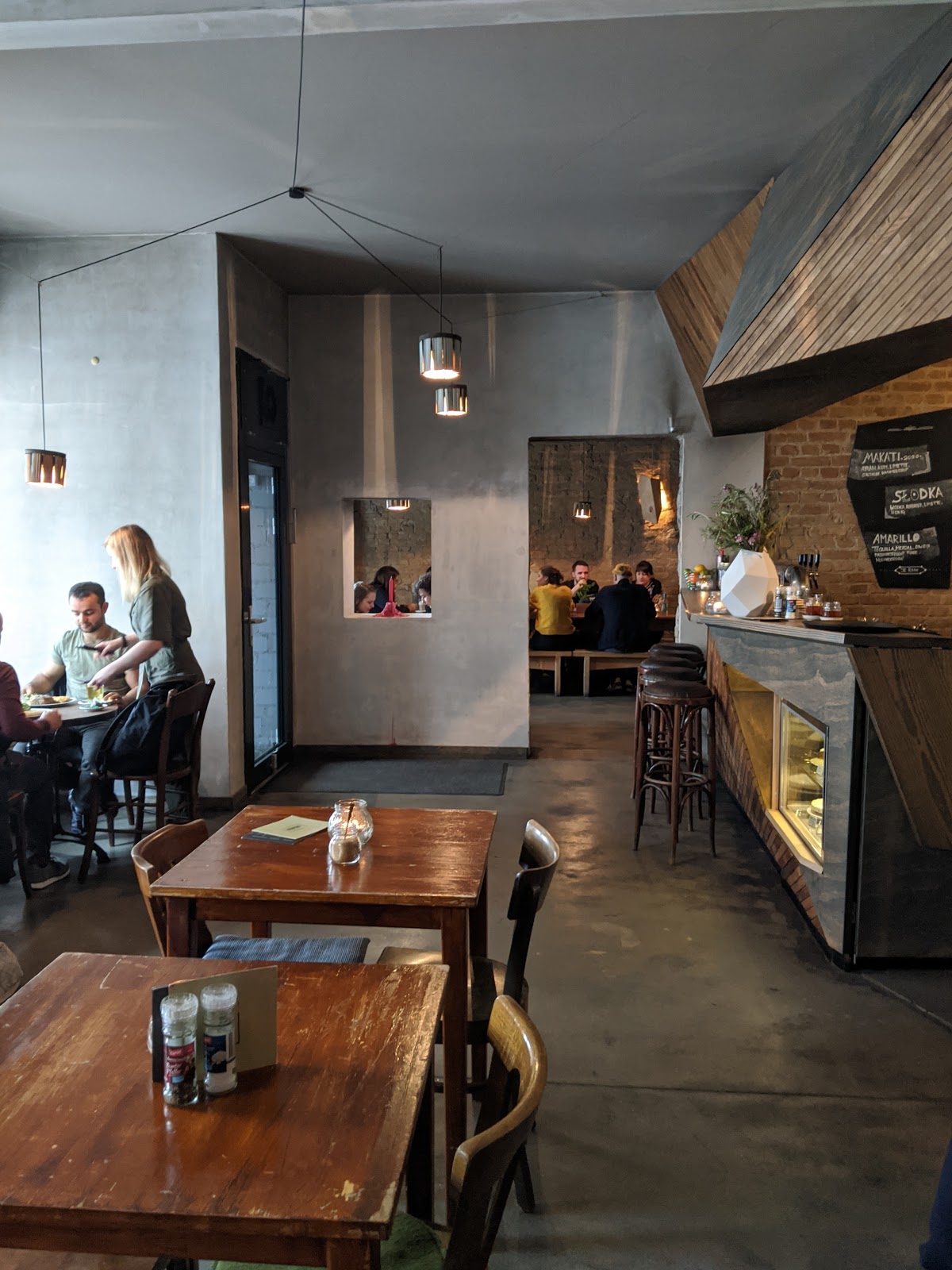 The food is fine, the place is nice, but the lazy Sunday morning theme has been taken one step too far: first we were waiting for the menu for so long that I stood up thinking you actually order at the bar. Then around half an hour for a Shakshouka and two omelettes. And the coffee, twenty minutes waiting for that, arrived in waves. The place was not full to the brim and there was little rotation.