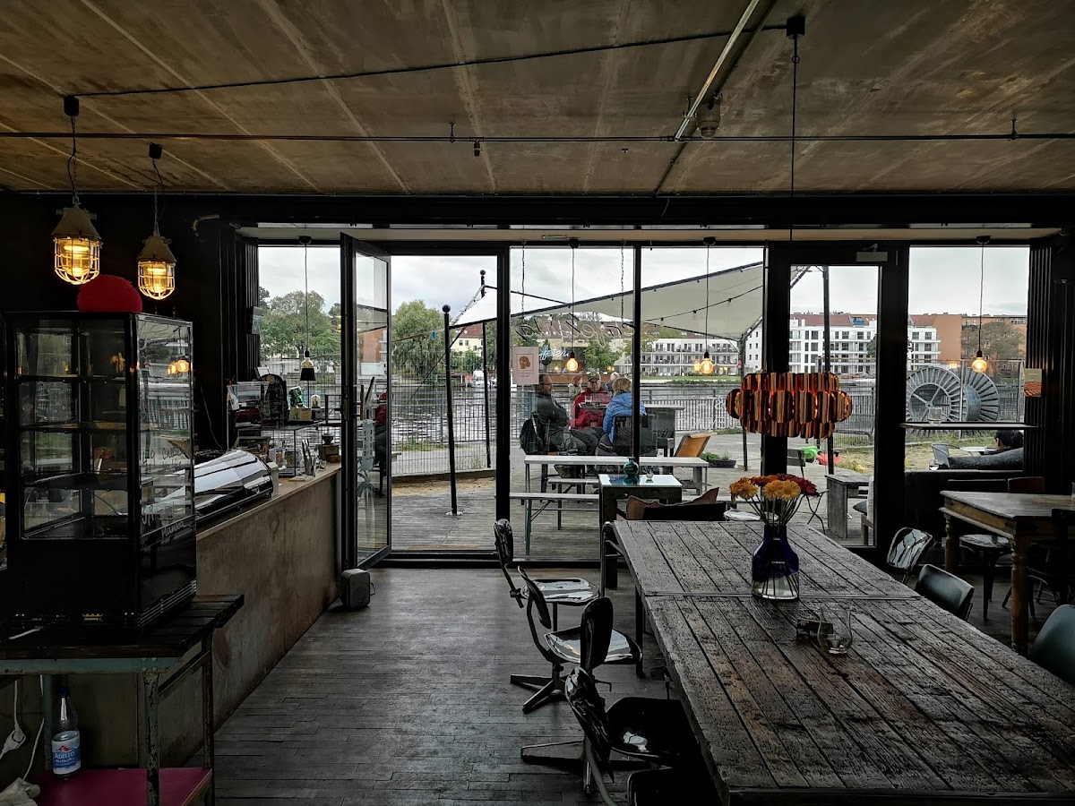 What a gem! Lovely interior, excellent service, good location in a very quiet part of the city right on the River Spree, great food and good coffee. Great place to come to if you have children, too as there's a sandpit with toys and bobby cars / tractors to drive on. We came here for a coffee because our daughter loves cranes, and it did not disappoint. She had a wonderful time playing in the sand while we enjoyed the late summer and a coffee in the sun. The service was really impressive! The barista was very friendly.