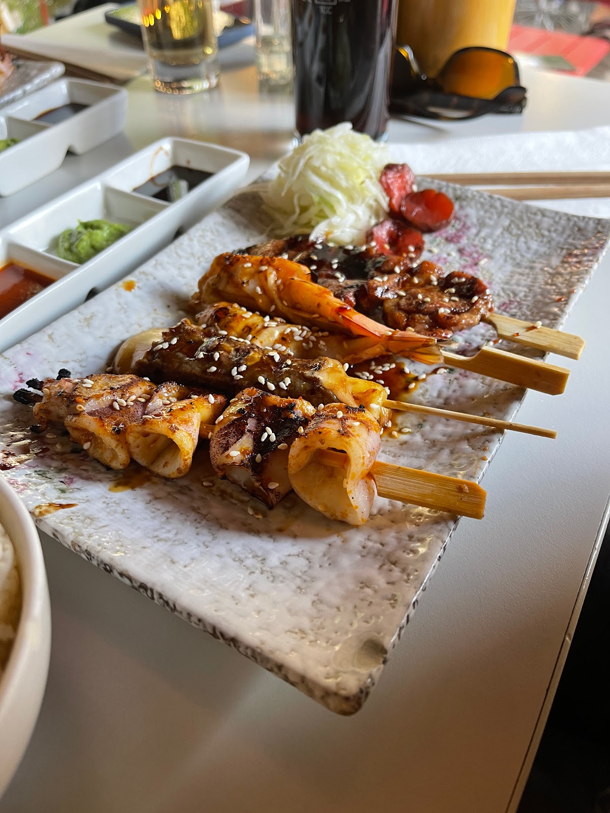 Kyo Grill was exactly what I was looking for after a long day: a relaxed atmosphere, quick service, uncomplicated menu, fair prices and delicious u0026 healthy food. We had the chicken ramen which was light and fresh as well as a selection of skewers of chicken, zucchini, prawn and squid, all of which were incredibly tasty and bursting with flavor. The skewers were served with complimentary rice and a trio of yummy dipping sauces. I ended up ordering a second round of skewers as I couldn’t resist the amazing flavours. I can’t wait to go back!