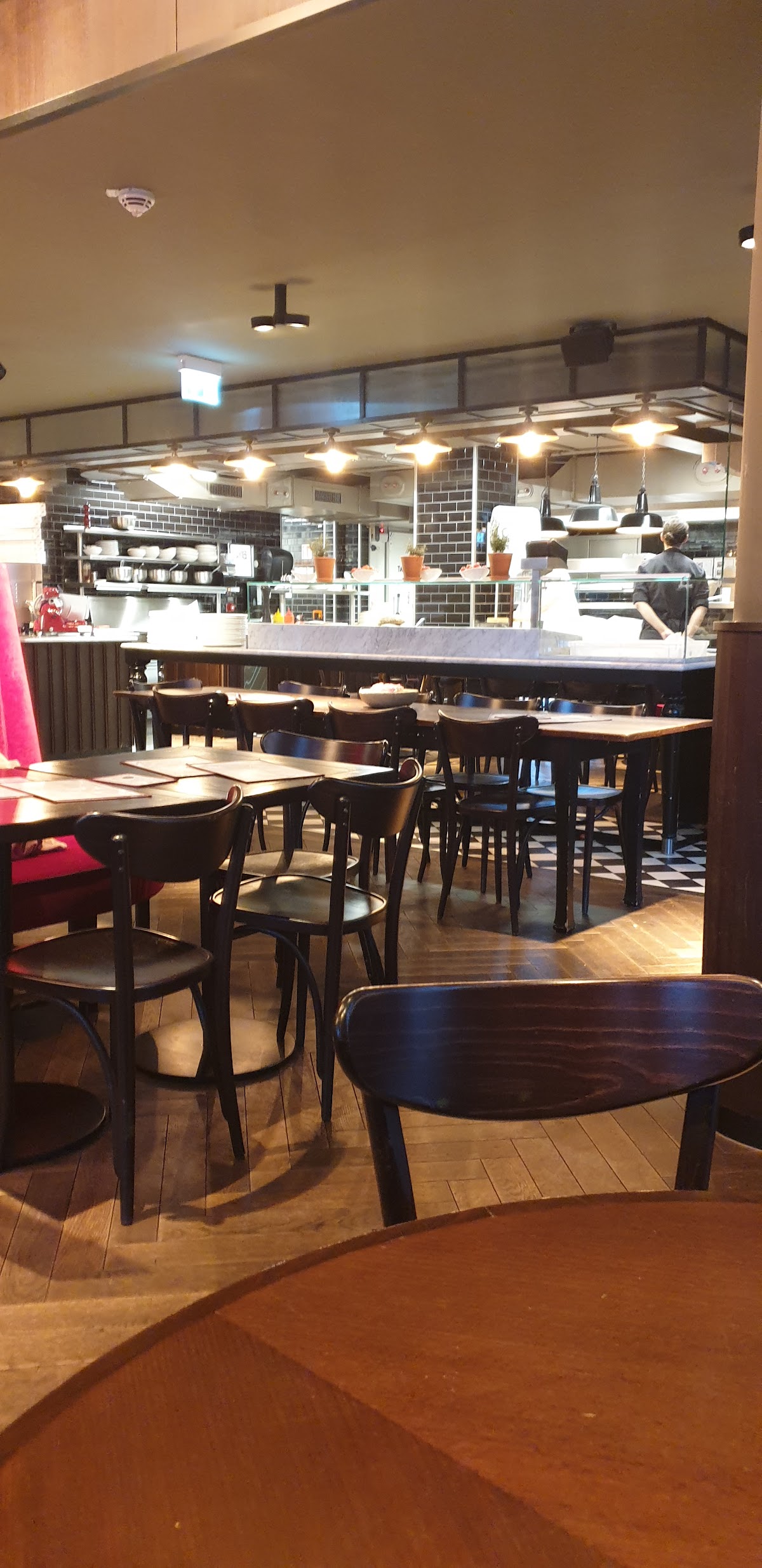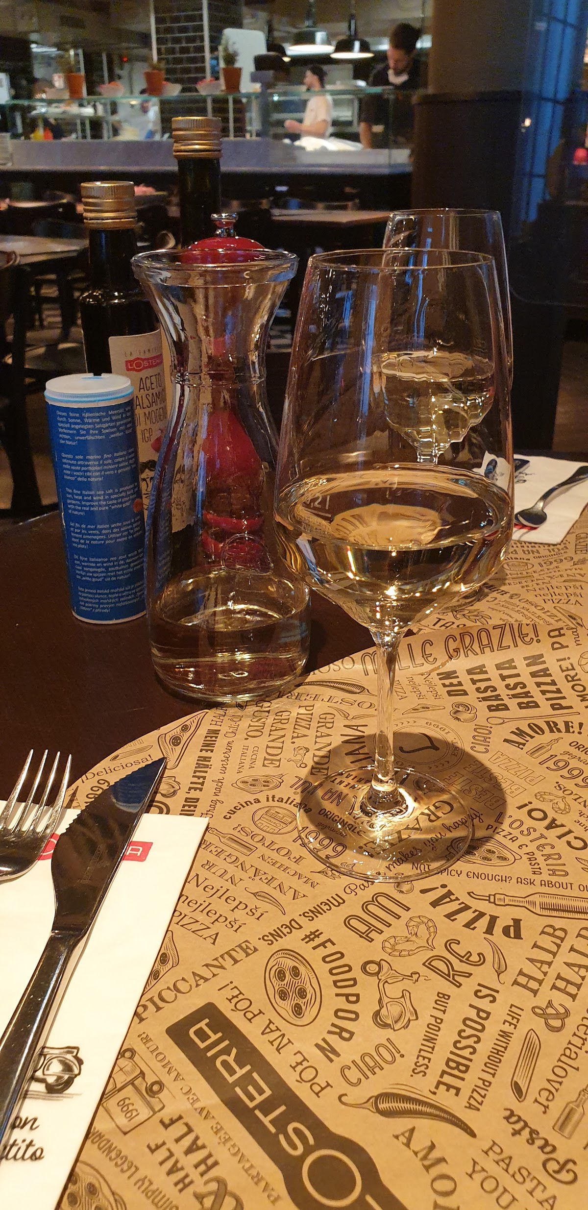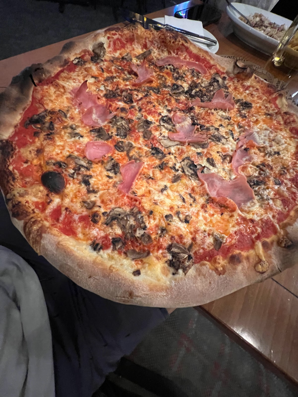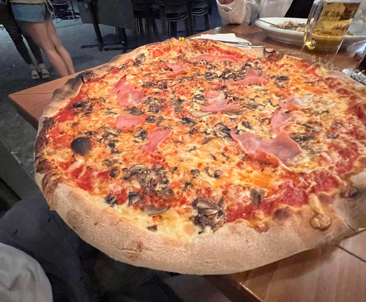 Very nice atmosphere and the staff was very polite and helpful. We got half a kilo of white wine, a salad and two pizzas. The food was very good and extremely filling. Especially the dough was ideal. The restaurant was clean and nicely decorated. Prices are normal.