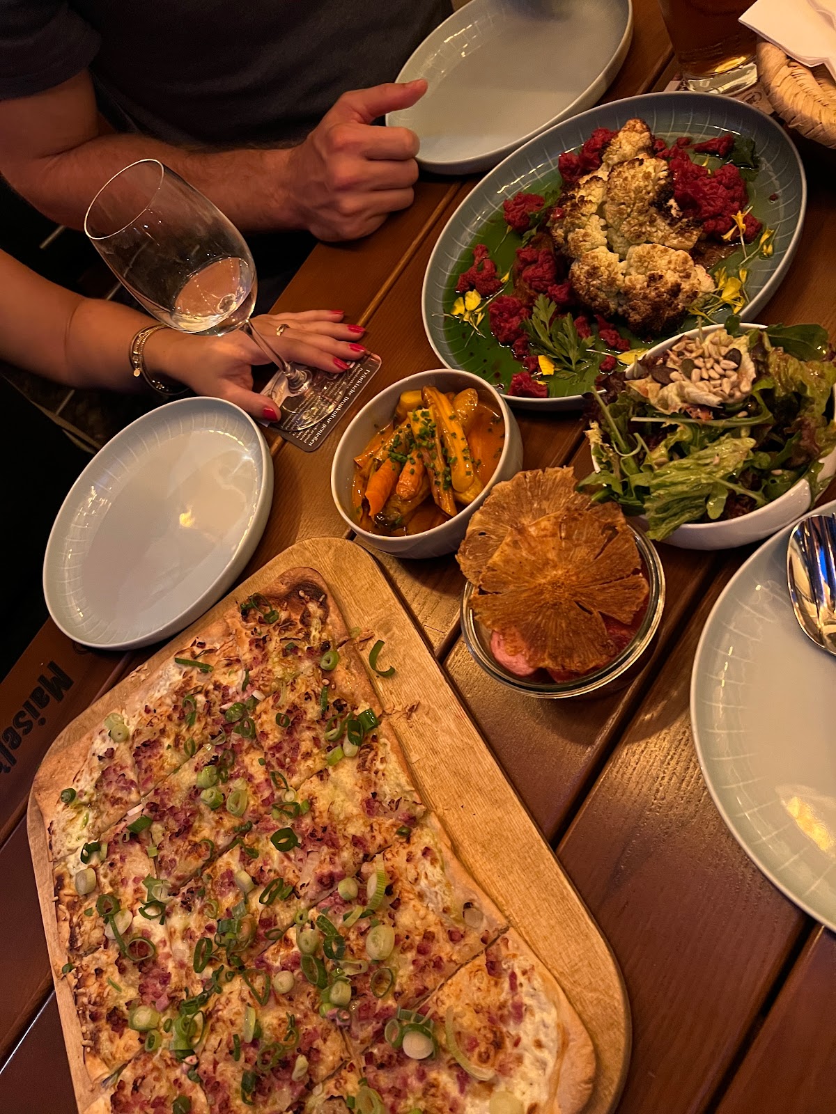 Cute restaurant with lots of outdoor seating— perfect for a group summer dinner. Really liked the concept, felt like german tapas. The flambé or flammekueche was probably my favorite, followed by the 3 variations of cauliflower. The waiter are also very friendly and helpful— offering detailed descriptions and fitting recommendations.